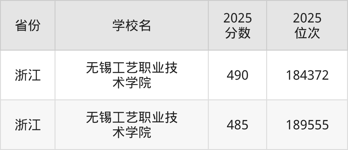 2025年无锡工艺职业技术学院在省外录取分数线范围整体位于485分到490分之间,录取分数线最低在浙江、录取分数线最高在浙江。