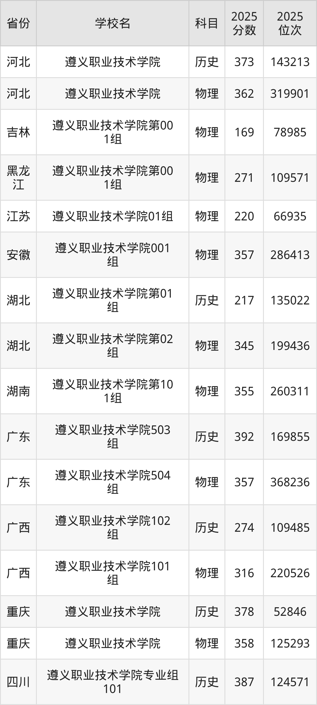 2025年遵义职业技术学院历史类最低分231分(88183名)、物理类最低分271分(202049名)。