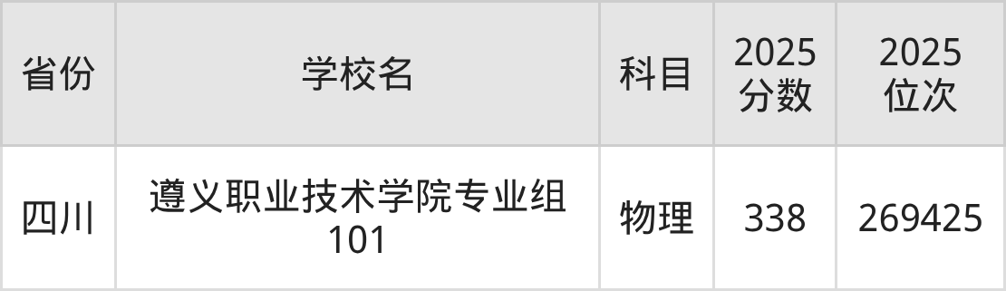 | 遵义职业技术学 院 | 物理 | 271 | 202049 |