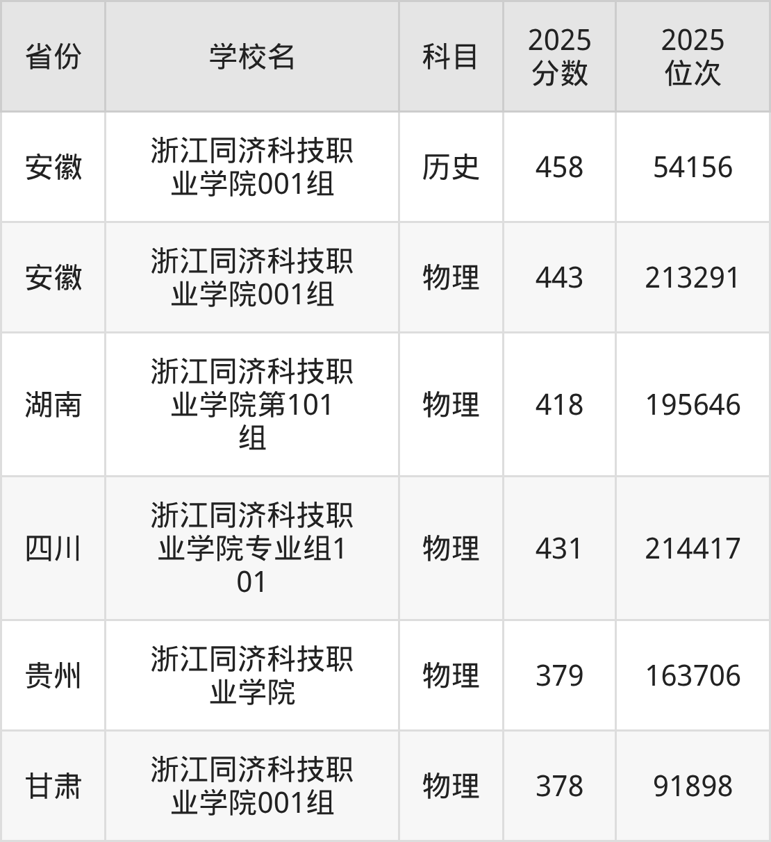 2026年浙江同济科技职业学院录取分数线预计在430分及以上,在各省录取最低分存在一定差异,如:2025年浙江同济科技职业学院在四川录取最低物理类431分,在贵州录取最低物理类379分,在甘肃录取最低物理类378分。