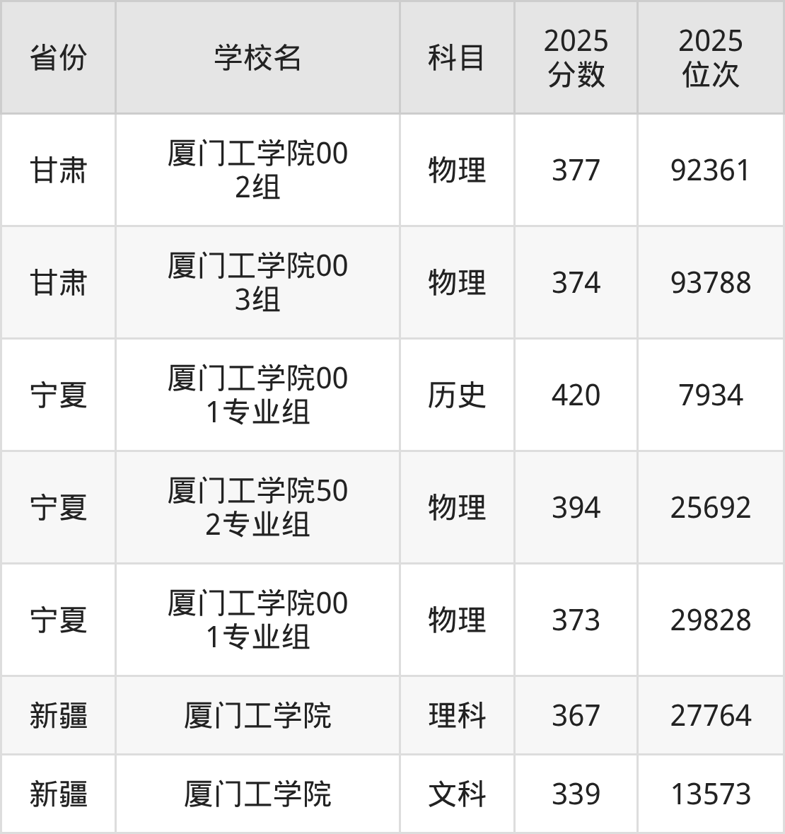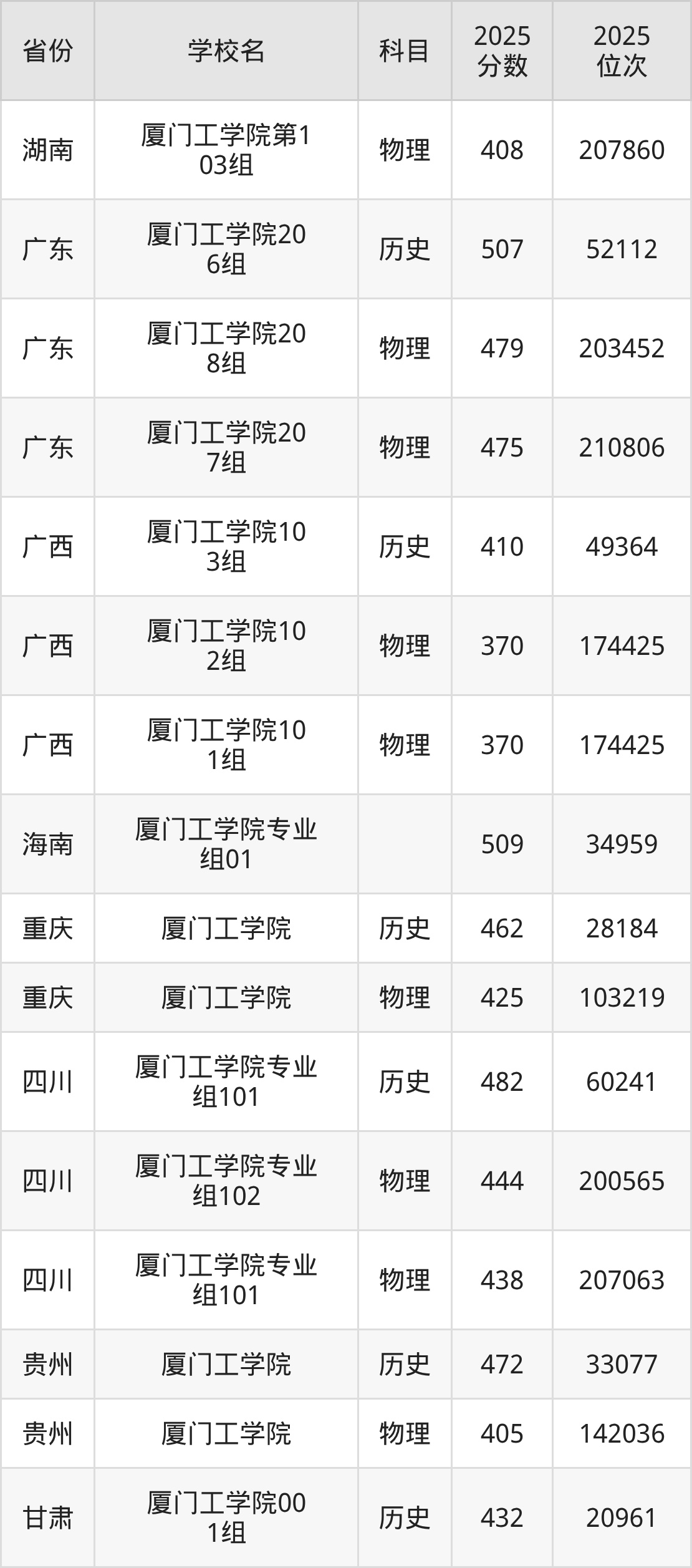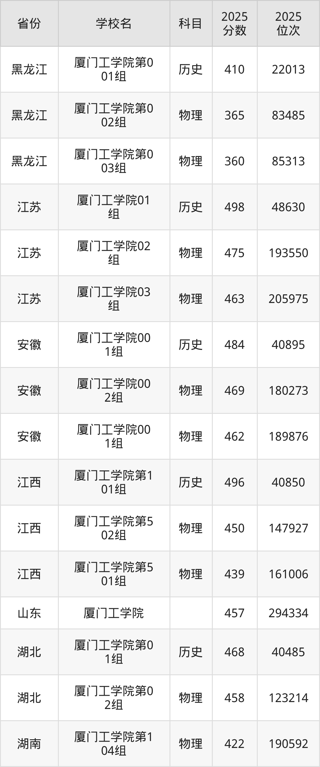 2025年厦门工学院历史类最低分450分(25562名)、物理类最低分441分(119155名)。