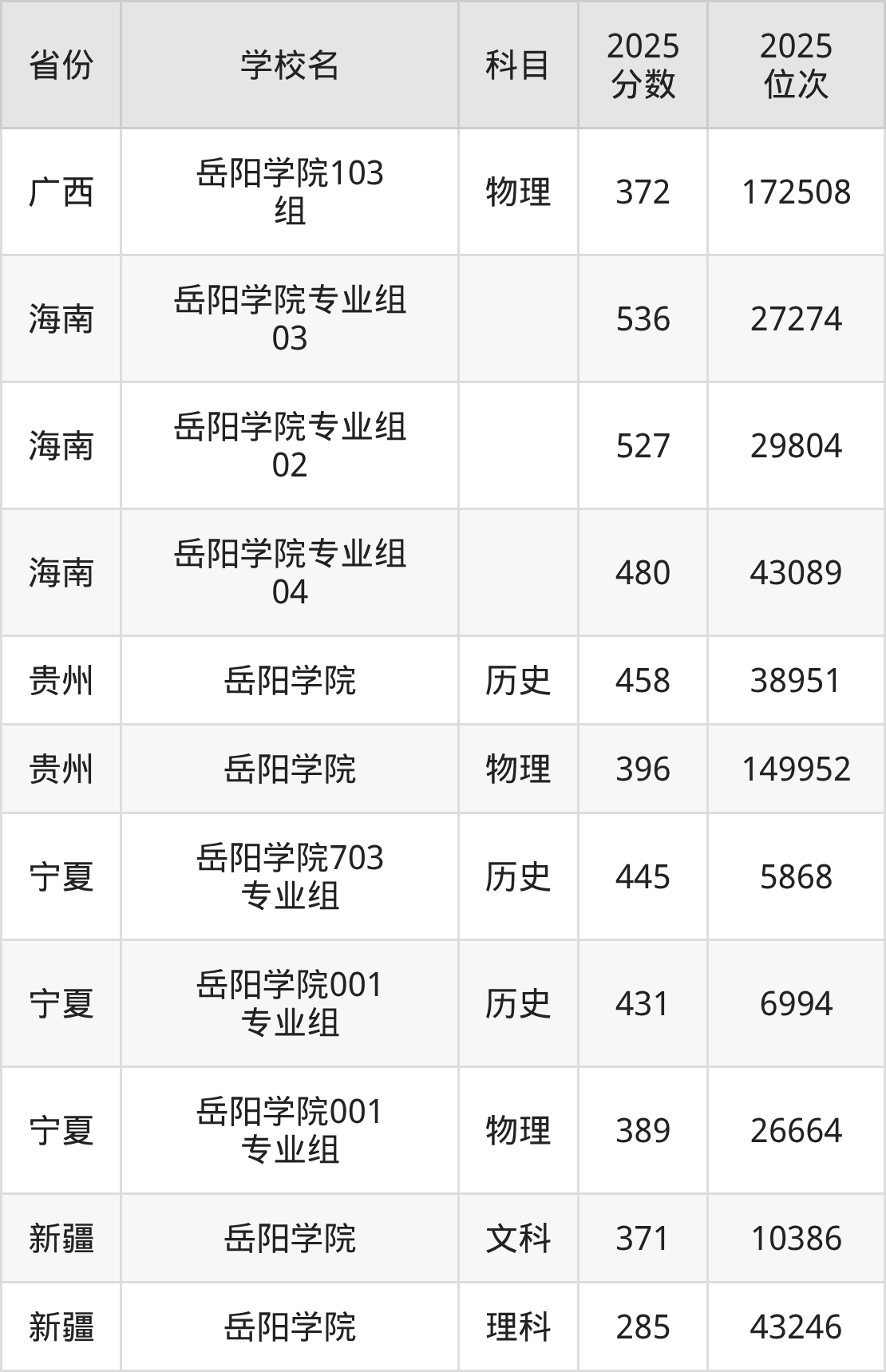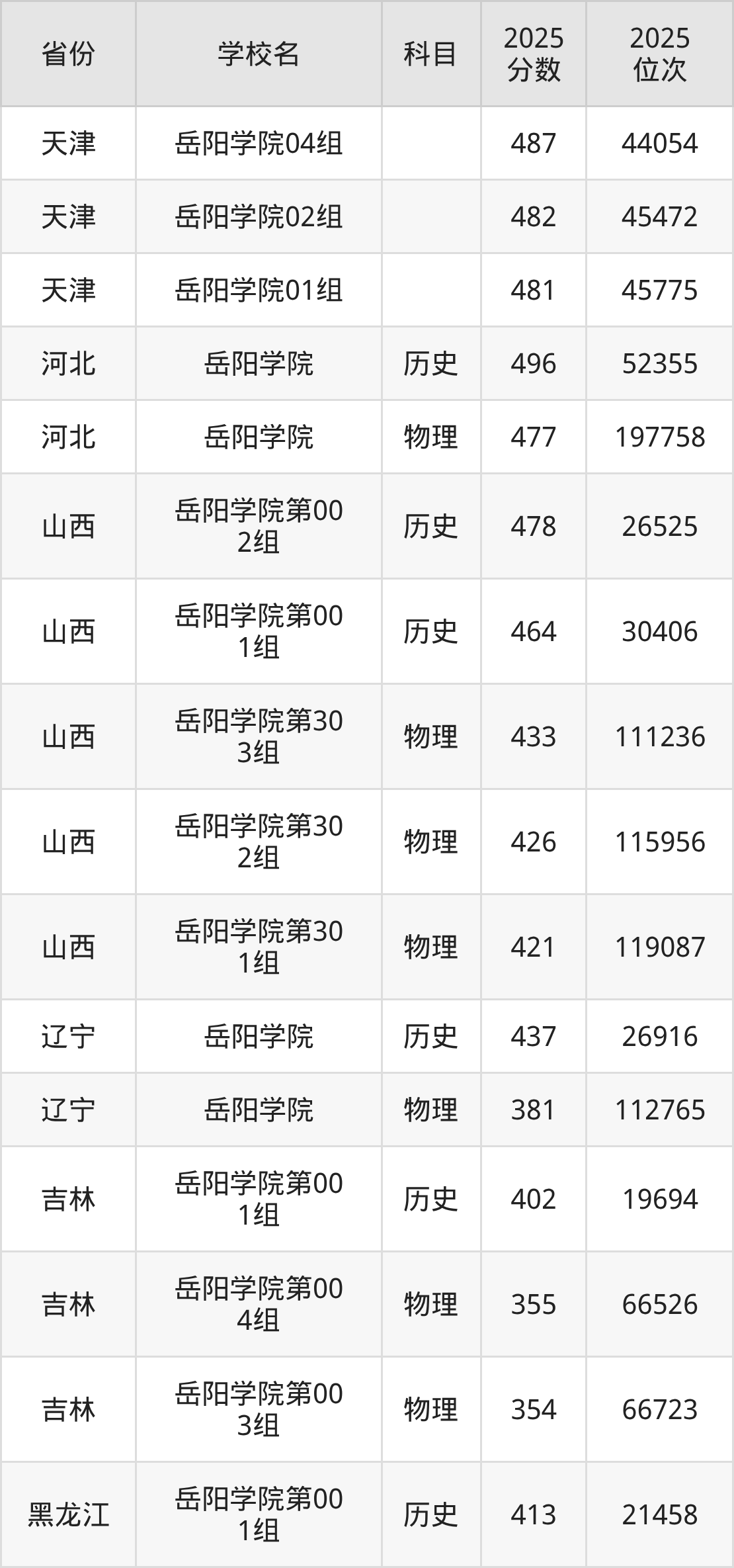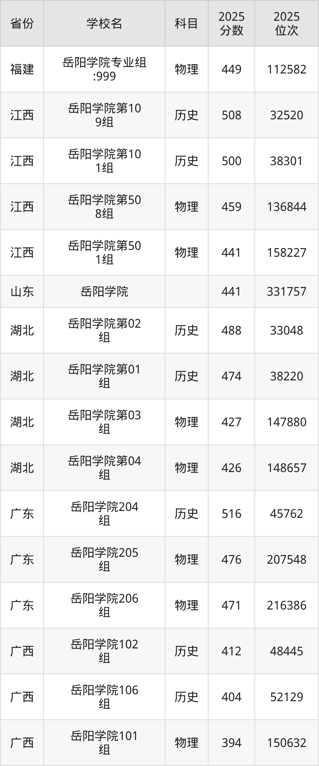 2025年岳阳学院历史类最低分451分(50382名)、物理类最低分426分(185558名)。