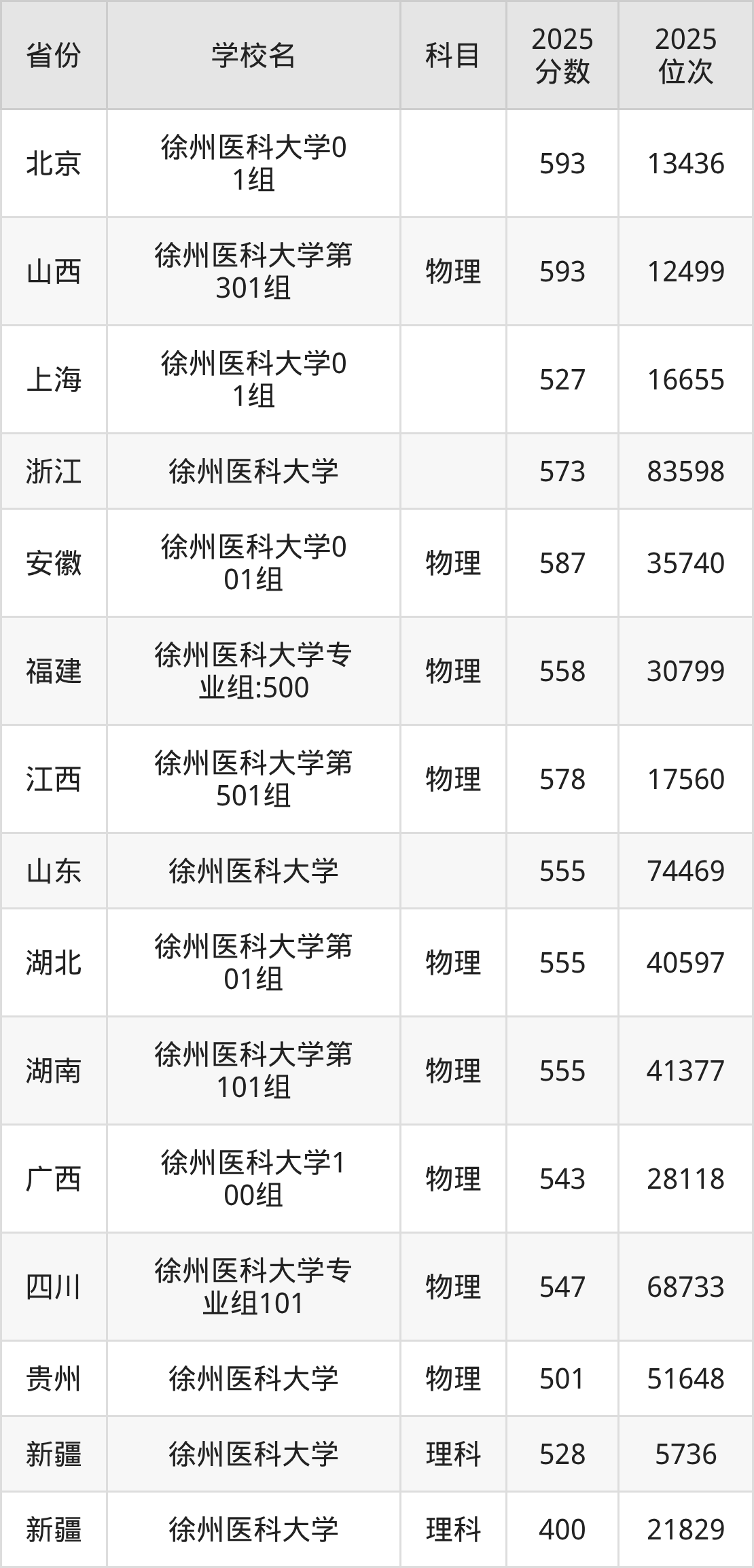 2025年徐州医科大学在省外录取分数线范围整体位于400分到593分之间,录取分数线最低在新疆理科、录取分数线最高在北京(01组)。