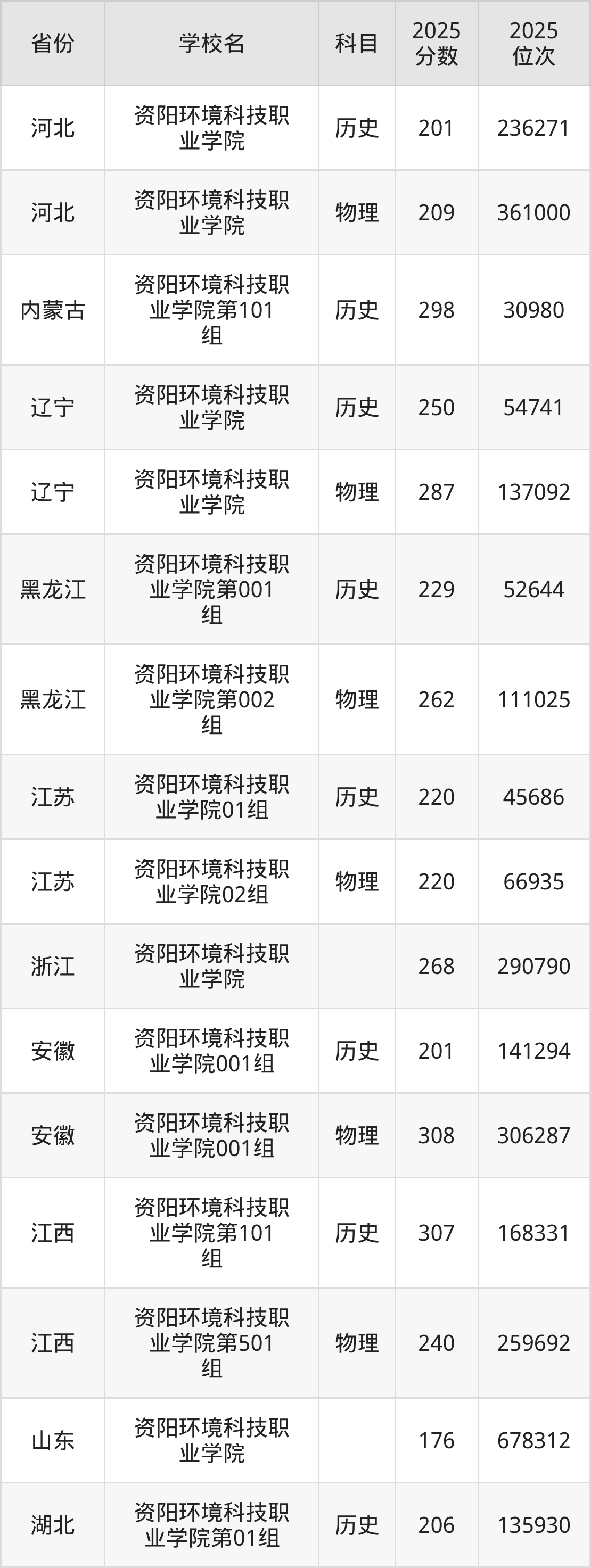 2025年资阳环境科技职业学院在省内分历史物理科目类录取,其中历史类最低分是150分、对应位次是177978名;物理类最低分是150分,对应位次是284789名。