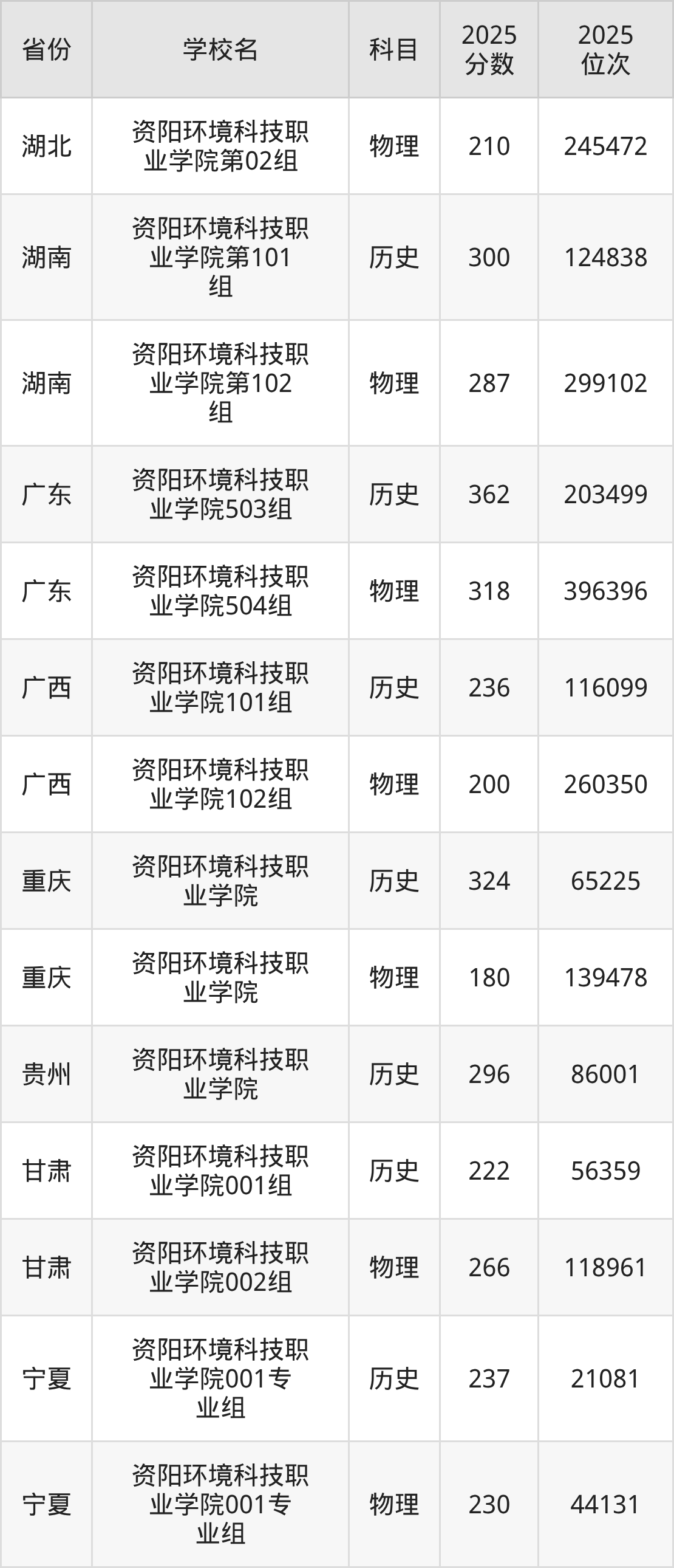 | 资阳环境科技职 业学院专业组1 01 | 历史 | 150 | 177978 |