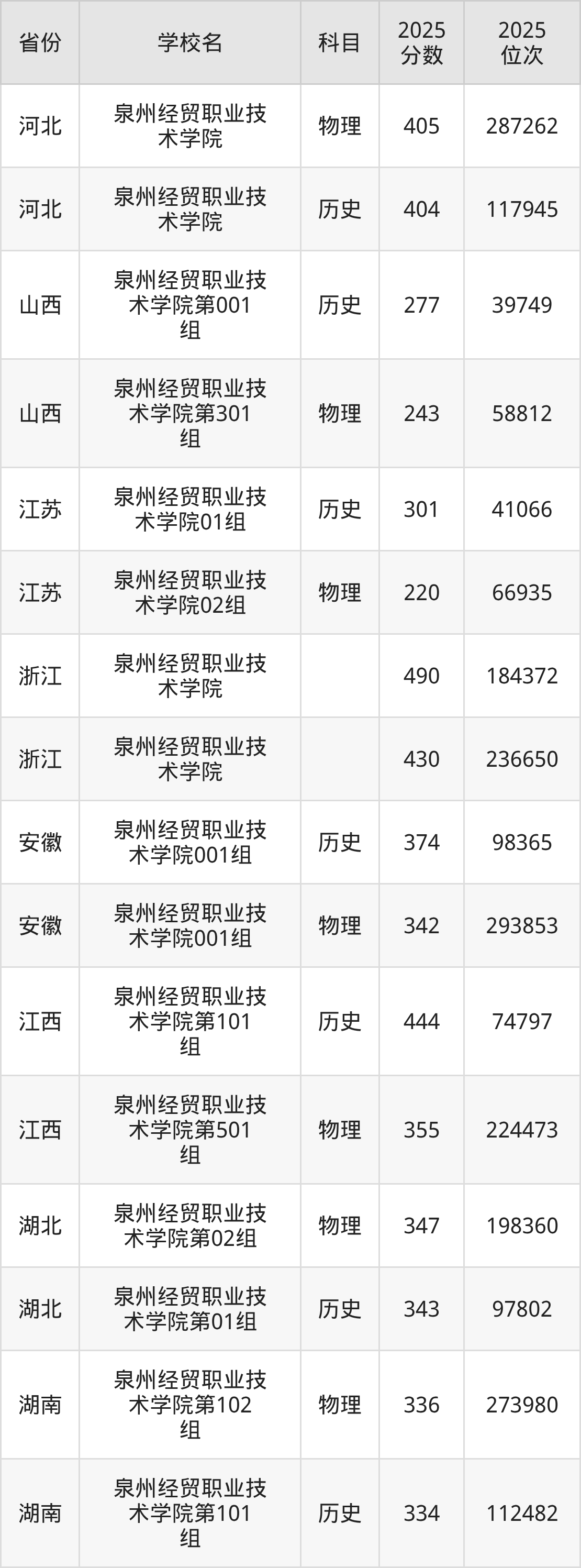 2025年泉州经贸职业技术学院历史类最低分343分(97802名)、物理类最低分347分(198360名)。