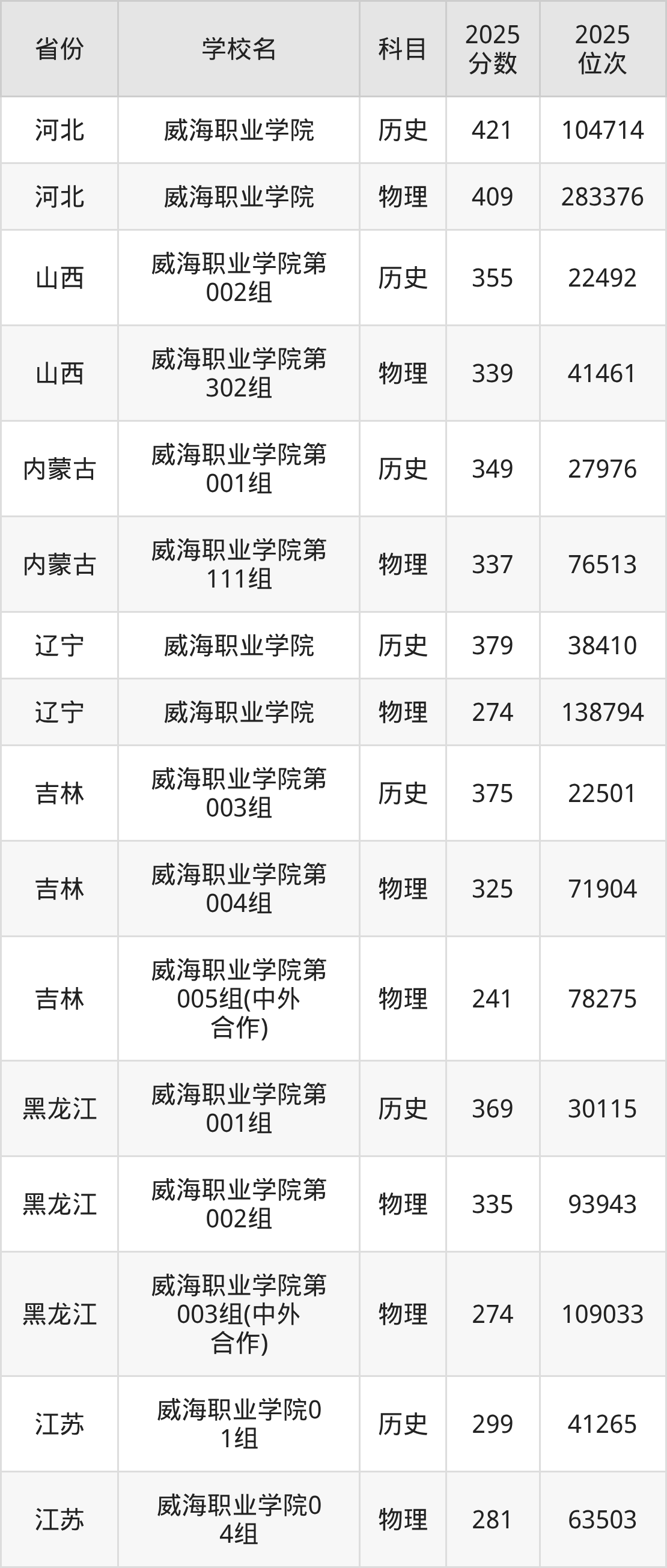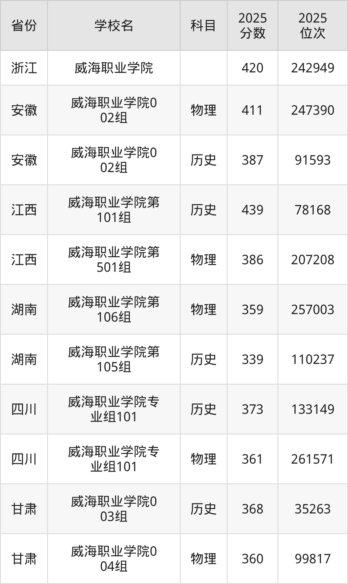 下面是威海职业学院2025年录取分数线各省汇总,一起来了解下吧。