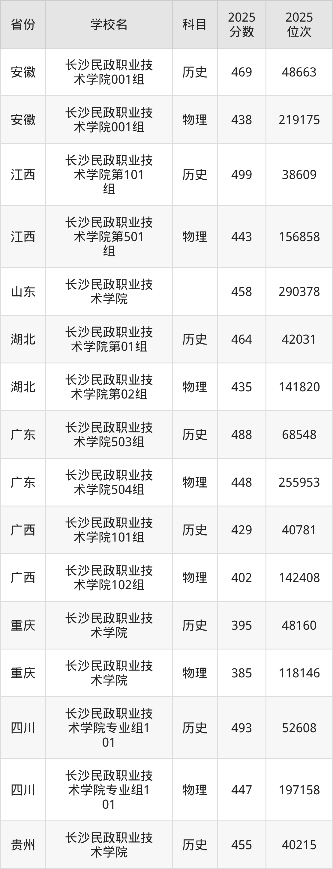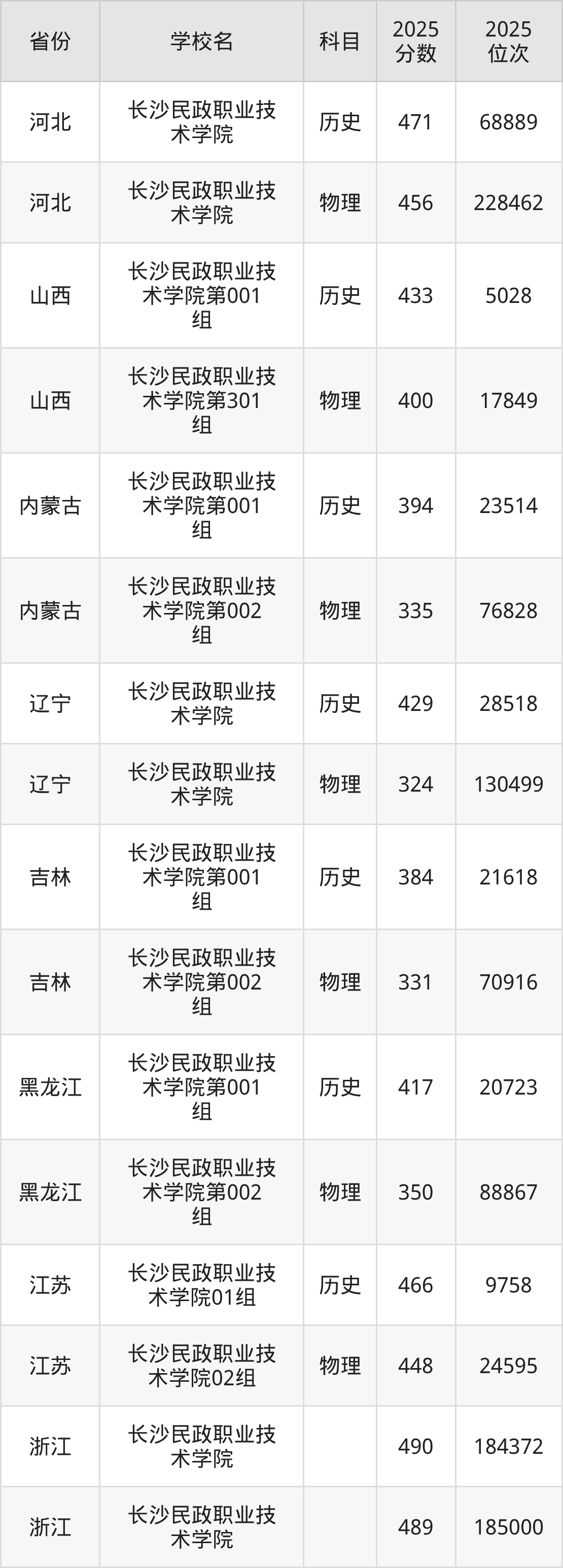 2025年长沙民政职业技术学院在省内分历史物理科目类录取,其中历史类最低分是436分、对应位次是58421名;物理类最低分是394分,对应位次是223775名。