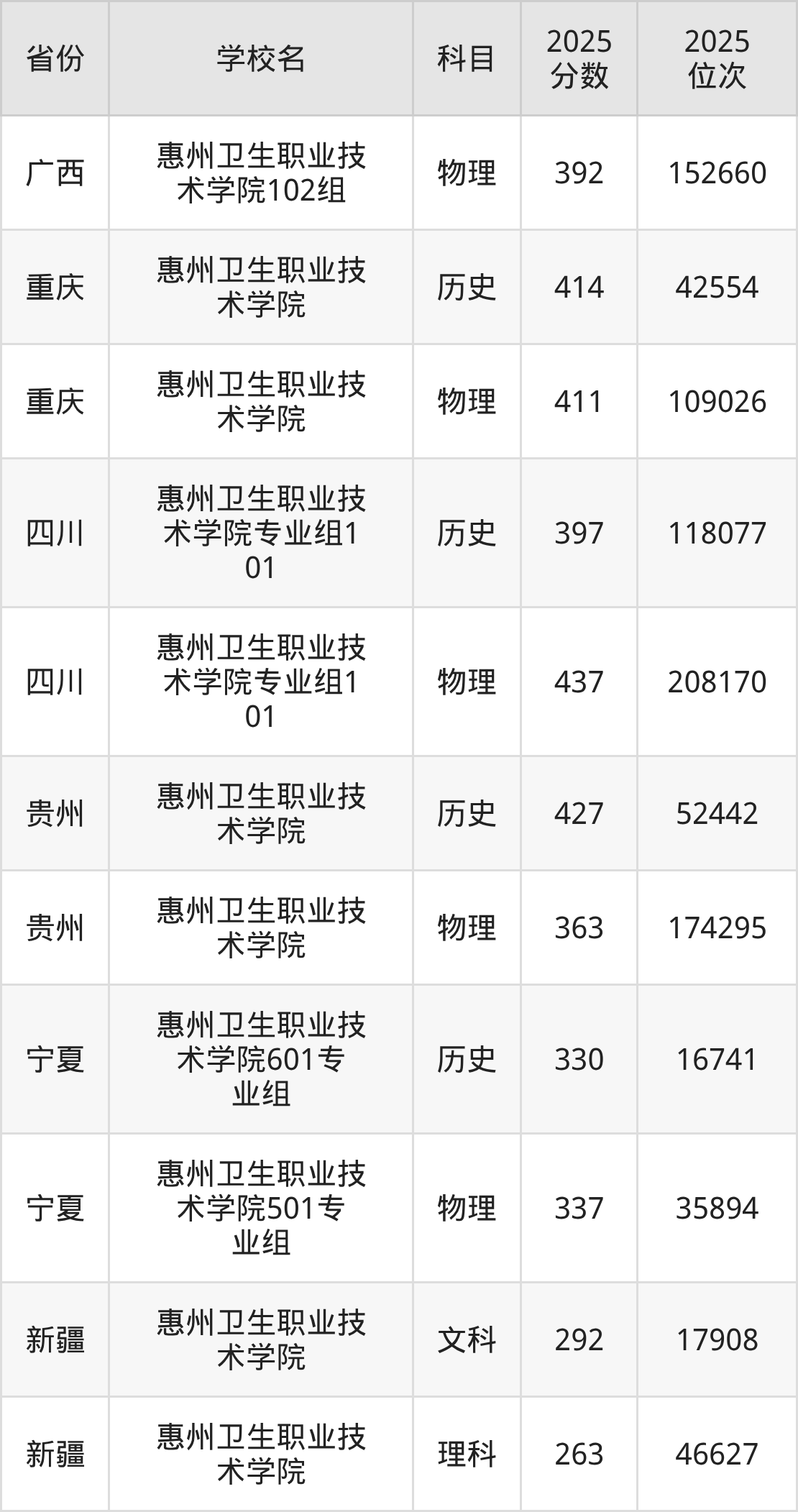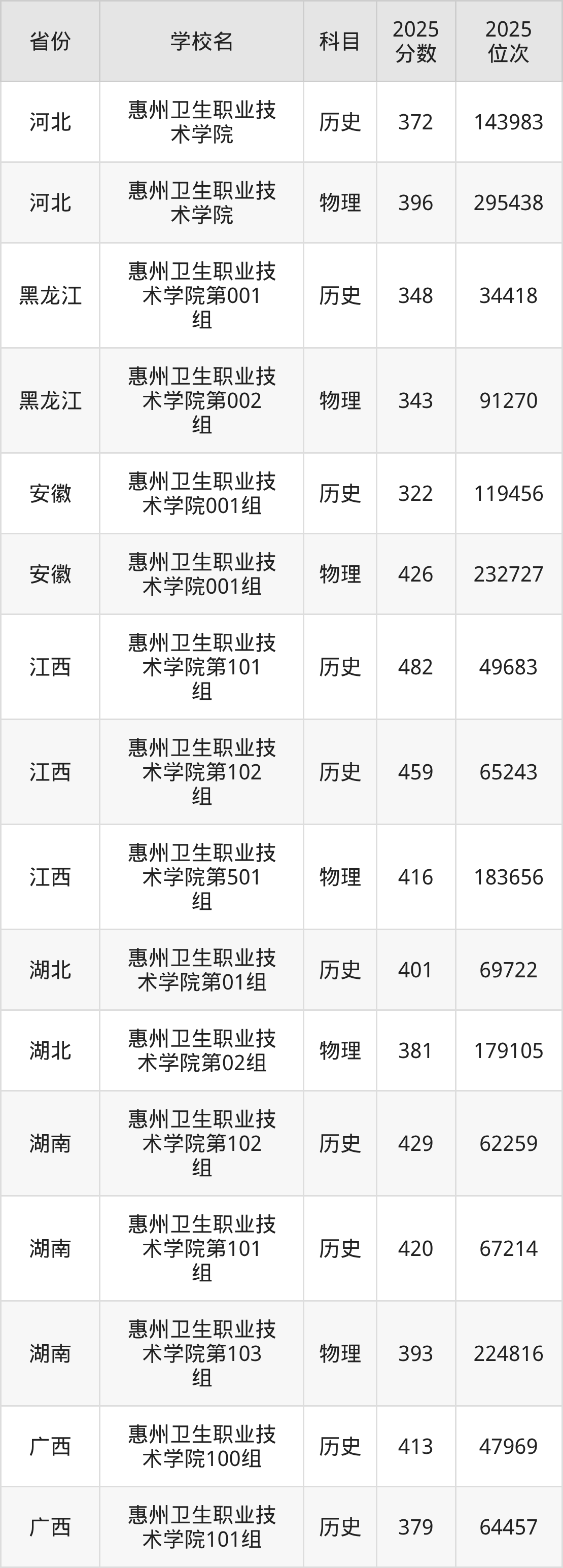 2025年惠州卫生职业技术学院历史类最低分440分(116237名)、物理类最低分382分(344603名)。