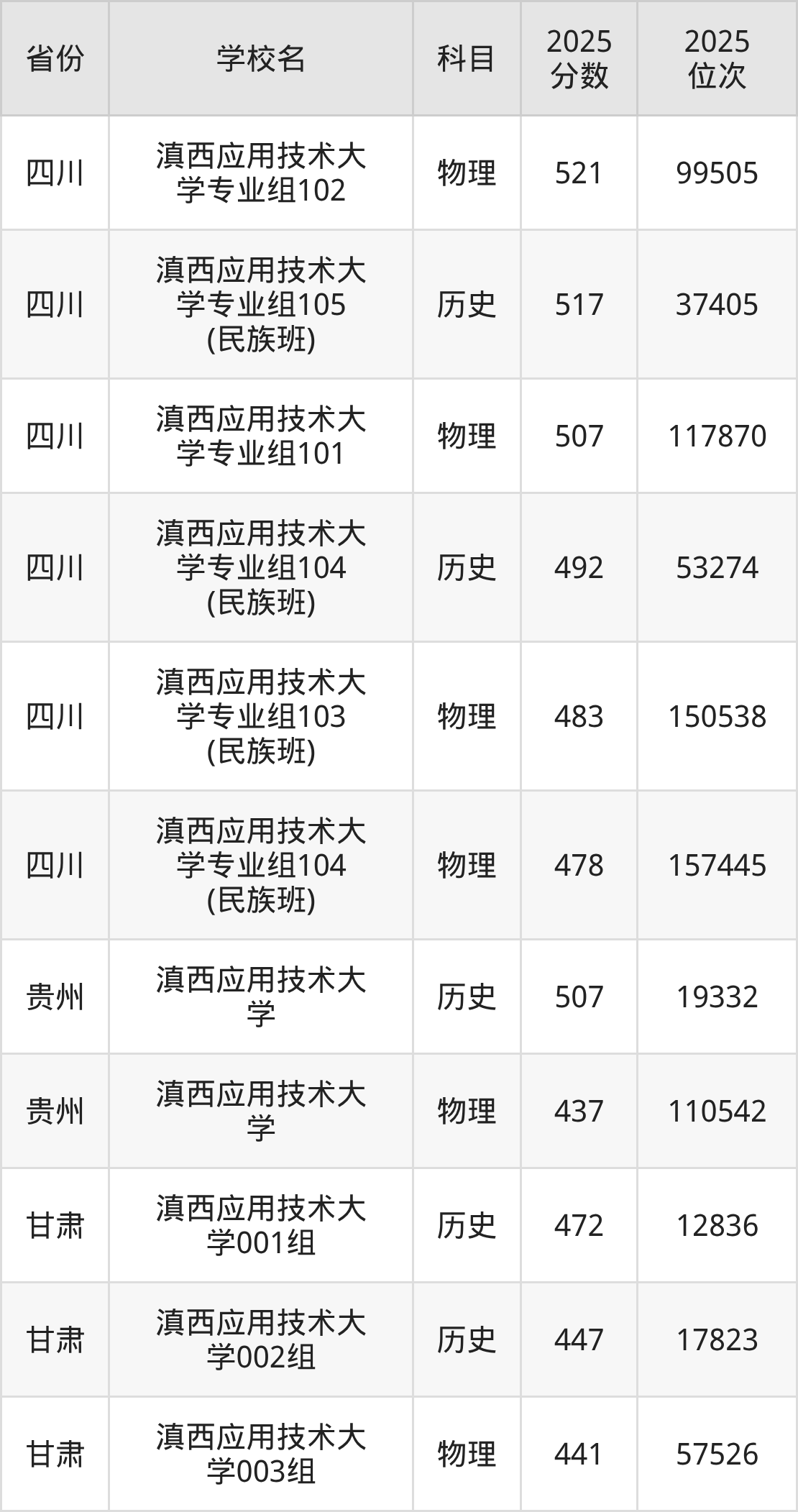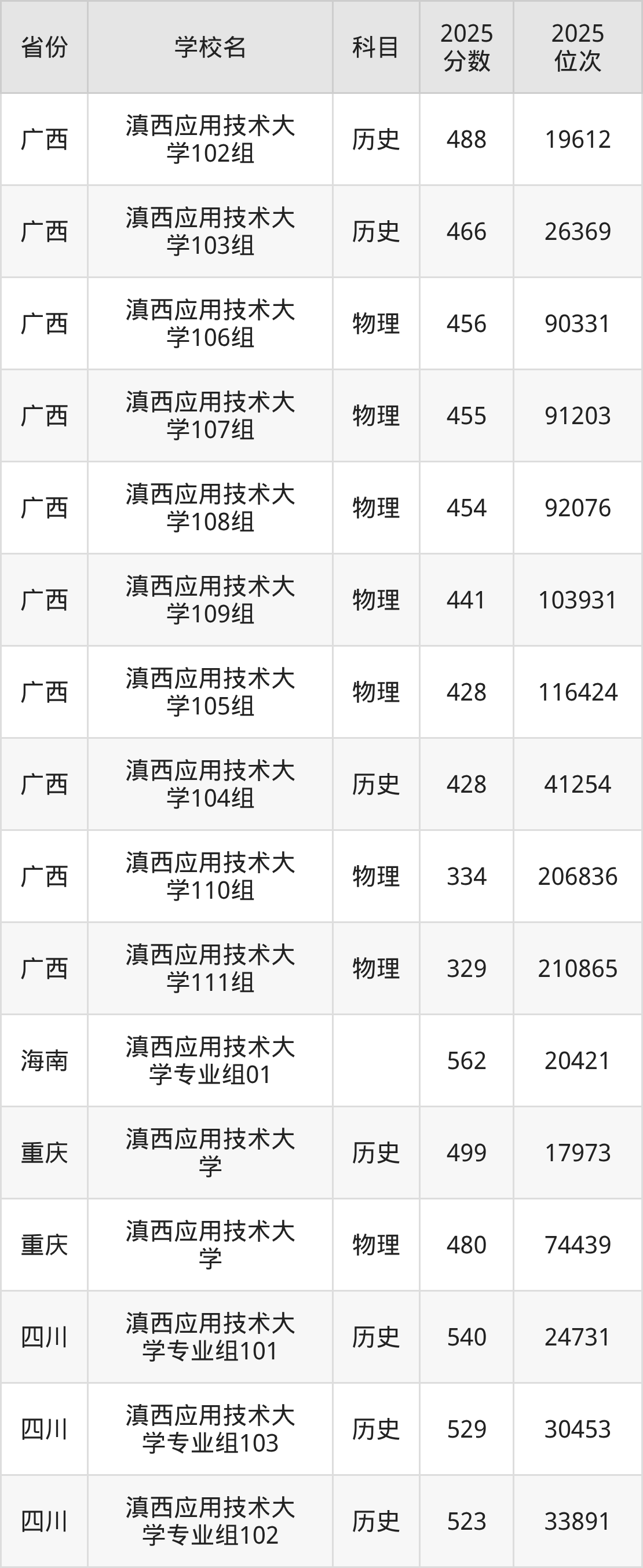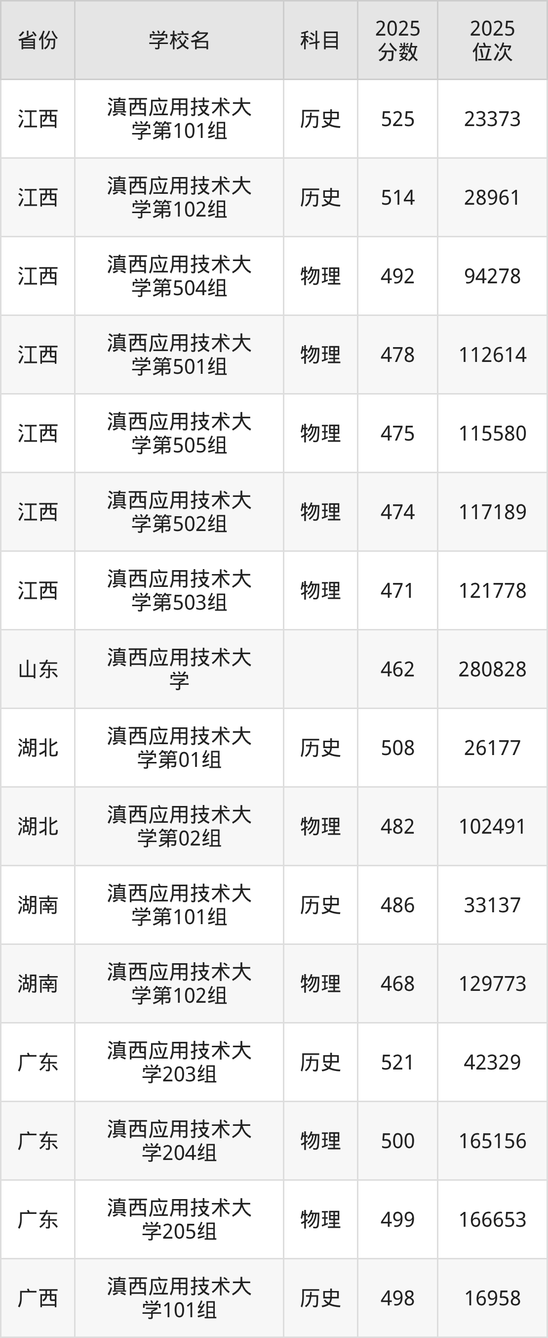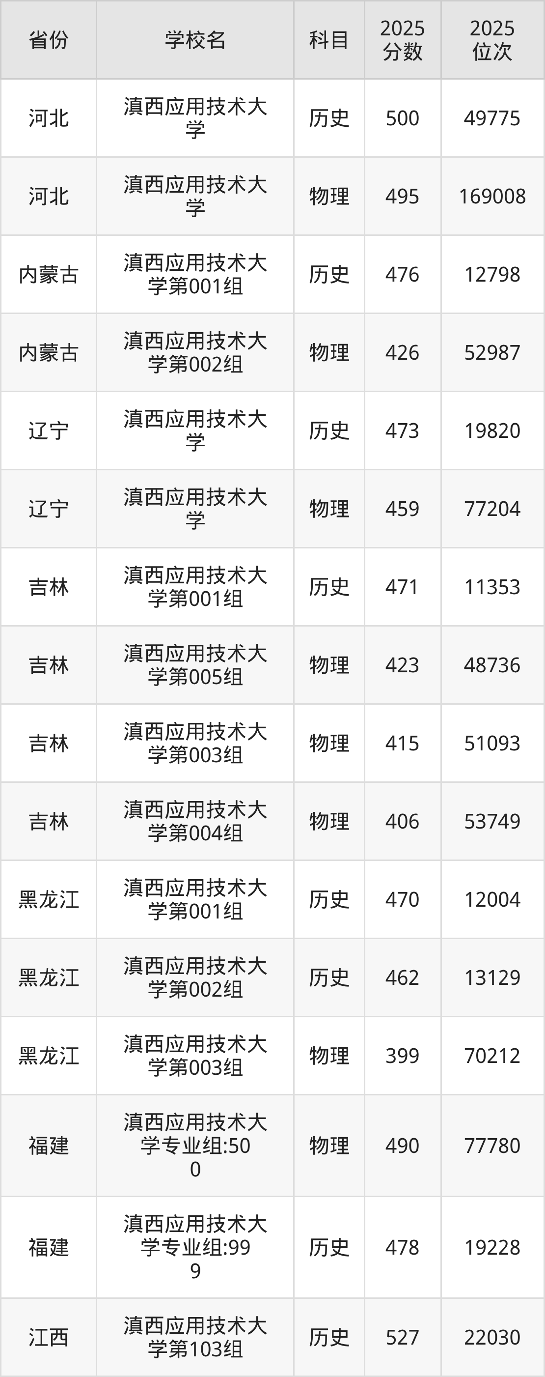2025年滇西应用技术大学历史类最低分514分(28961名)、物理类最低分471分(121778名)。