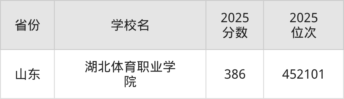 2025年湖北体育职业学院在省外录取分数线是386分,录取分数线最低在山东。