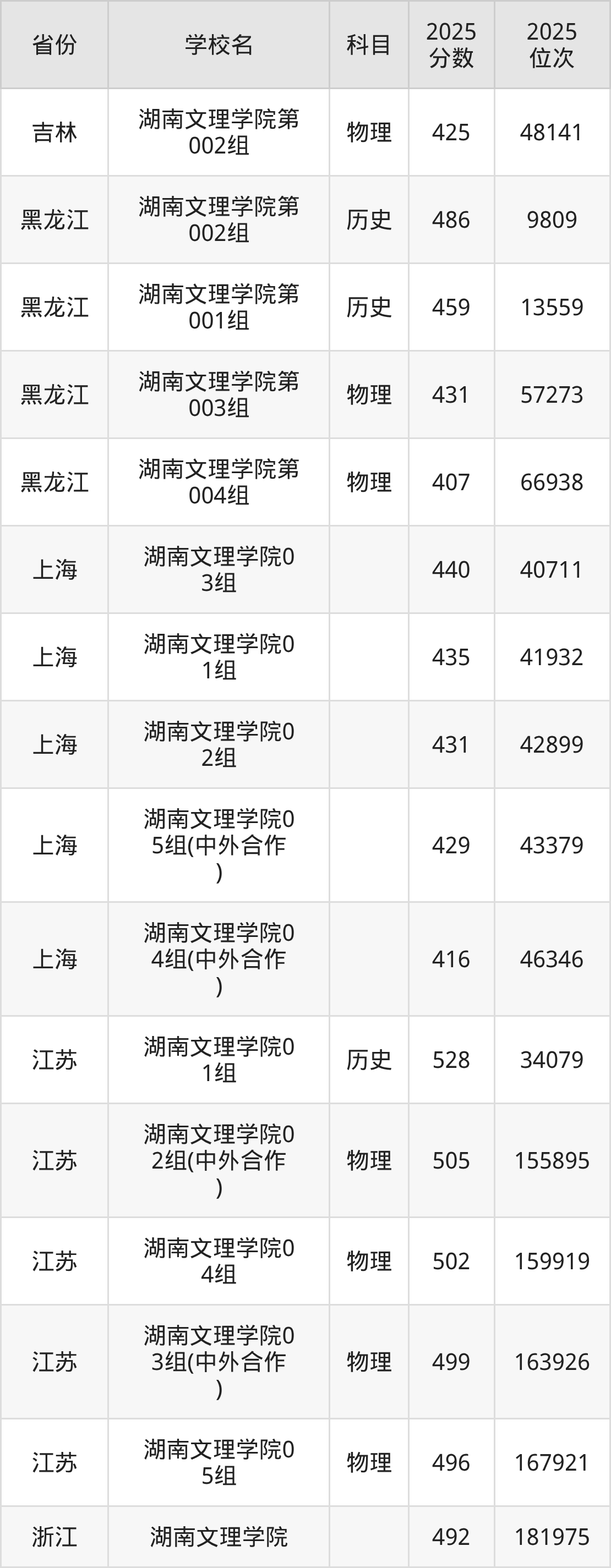 | 湖南文理学院第 812组(预科 班)(面向江永 县) | 历史 | 479 | 36291 |