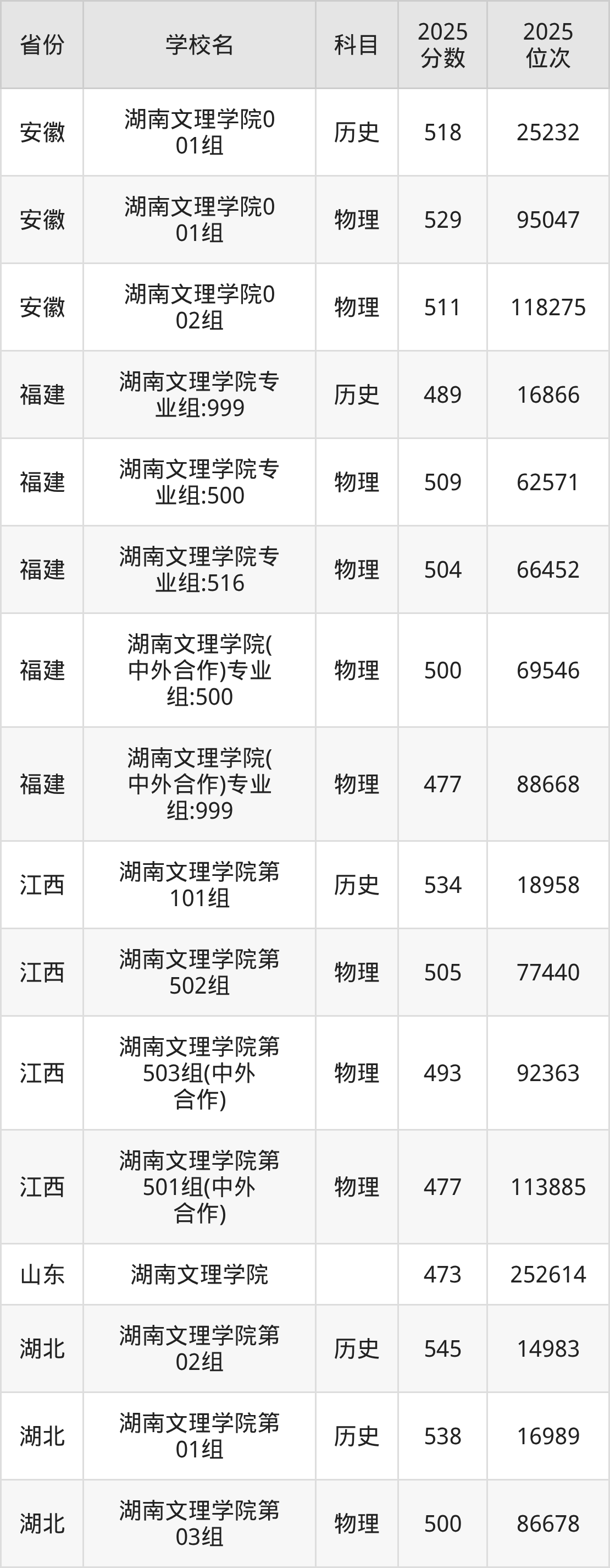 | 湖南文理学院第 818组(预科 班)(面向通道 县) | 历史 | 479 | 36291 |