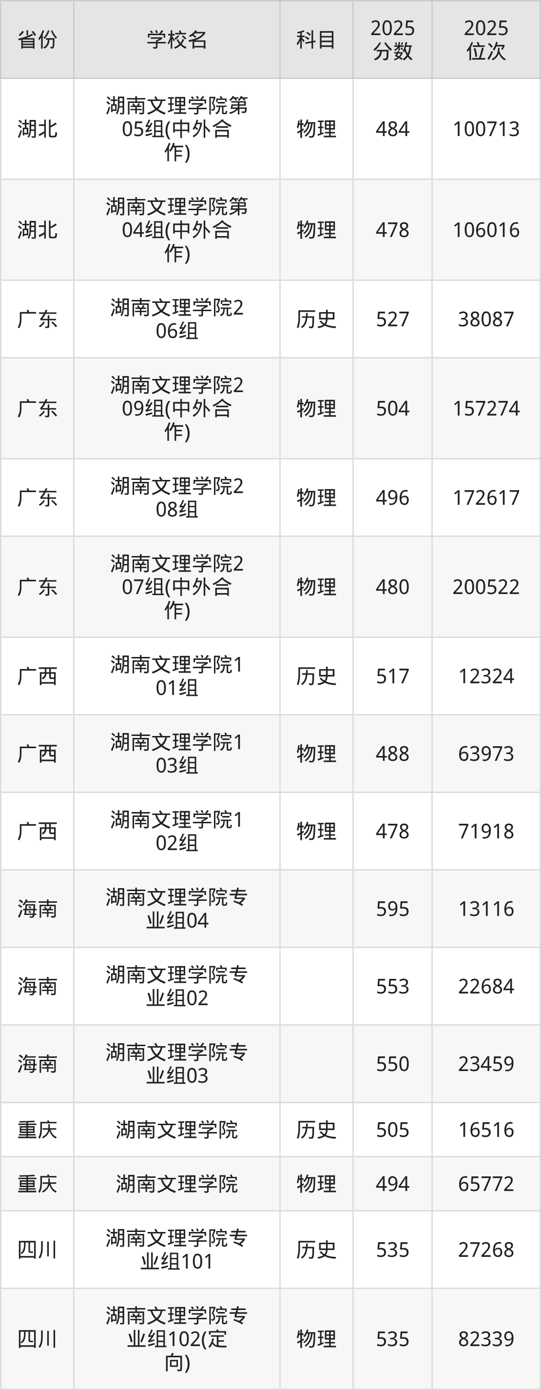 | 湖南文理学院第 820组(预科 班)(面向全省 ) | 物理 | 469 | 128457 |
