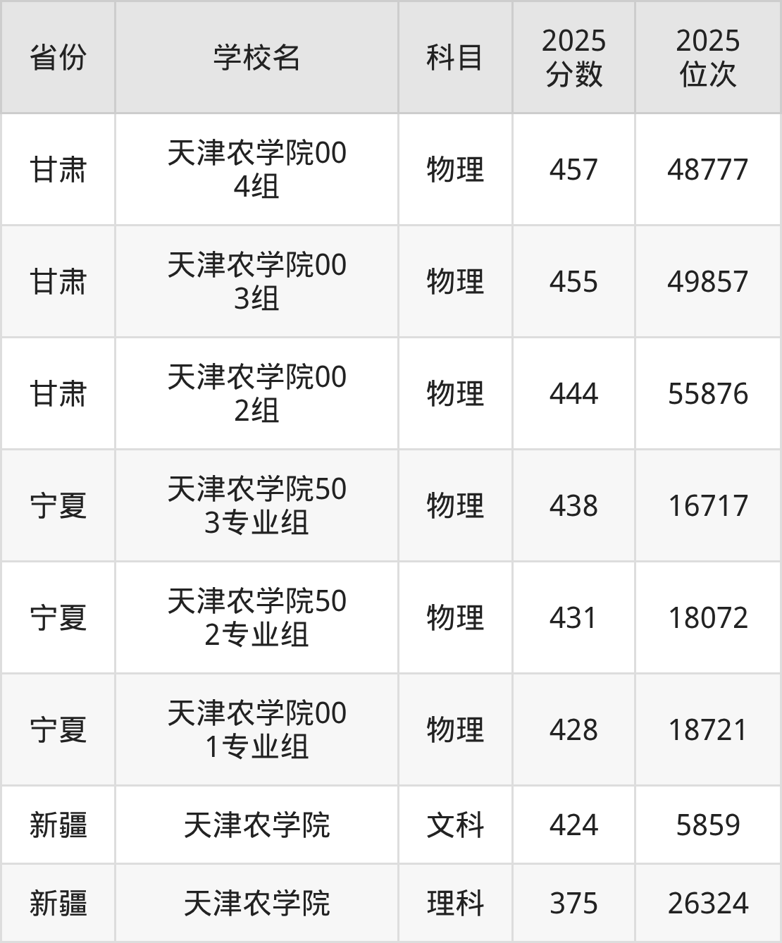 2025年天津农学院在市外录取分数线范围整体位于375分到575分之间,录取分数线最低在新疆理科、录取分数线最高在海南(专业组03)。