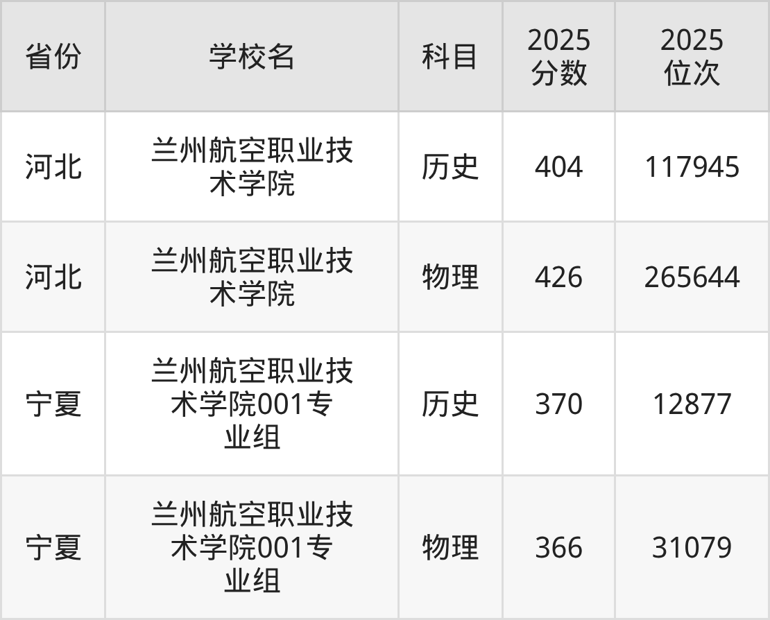 2025年兰州航空职业技术学院历史类最低分273分(53428名)、物理类最低分337分(107834名)。