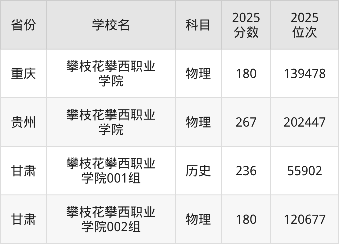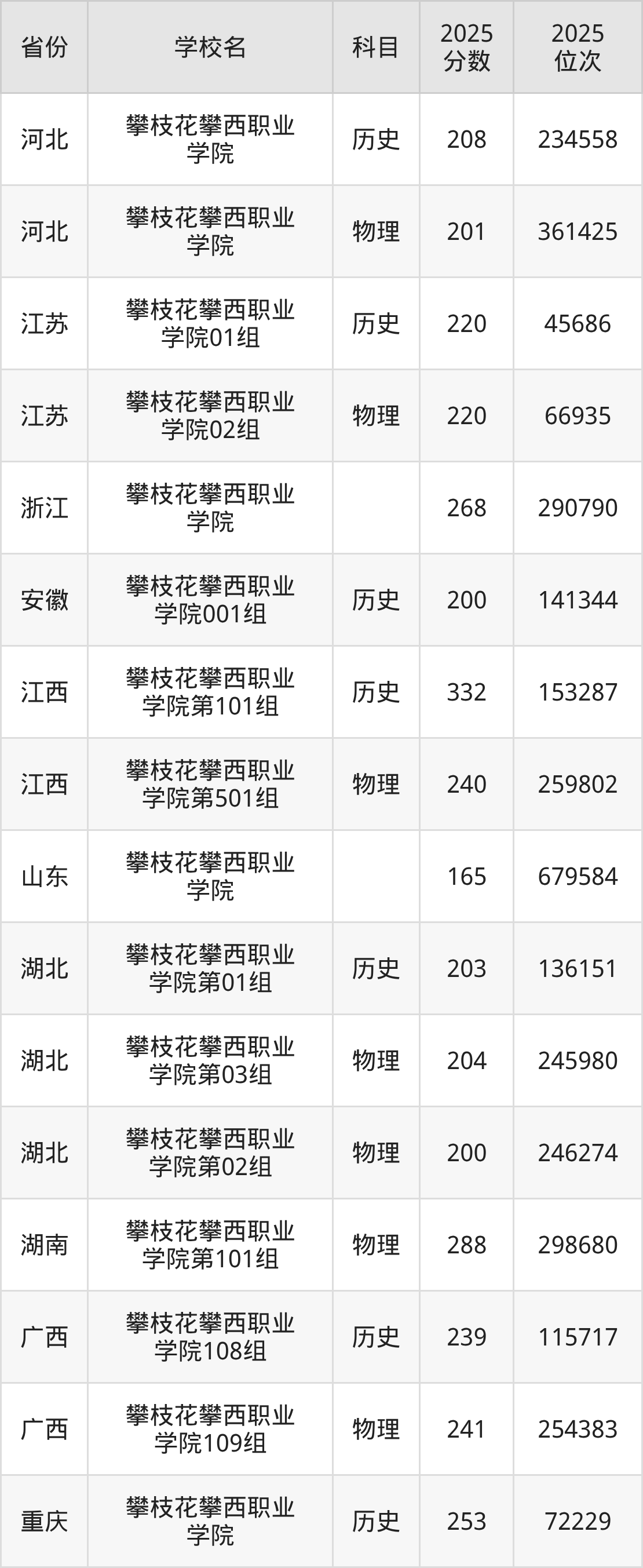 2025年攀枝花攀西职业学院在省内分历史物理科目类录取,其中历史类最低分是150分、对应位次是177978名;物理类最低分是150分,对应位次是284789名。