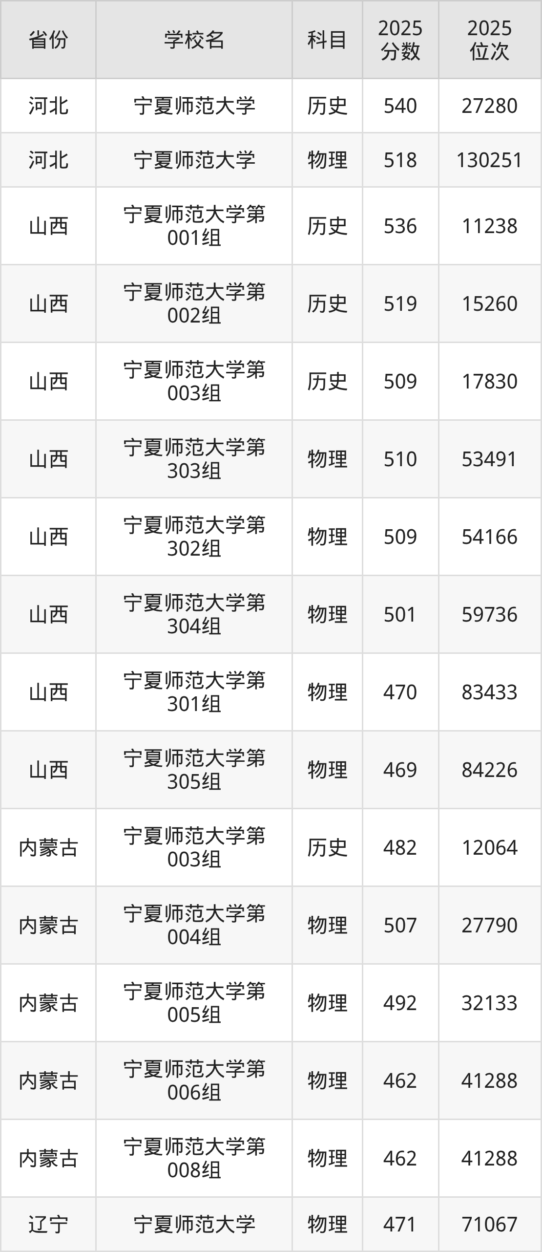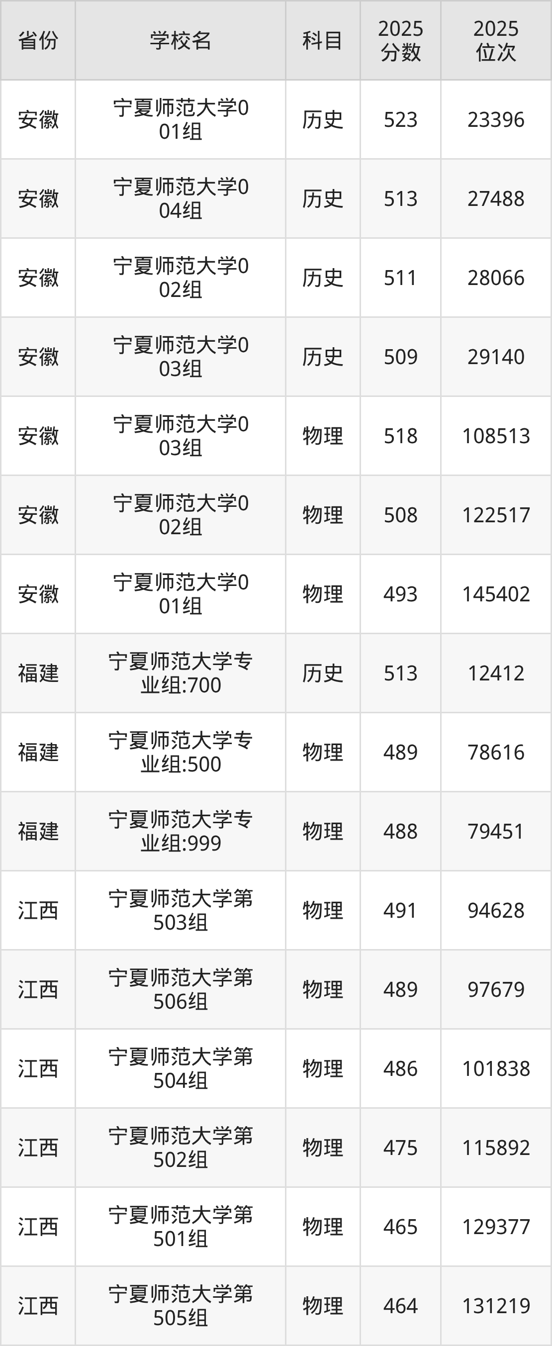 | 宁夏师范大学0 10专业组 | 历史 | 451 | 5432 |