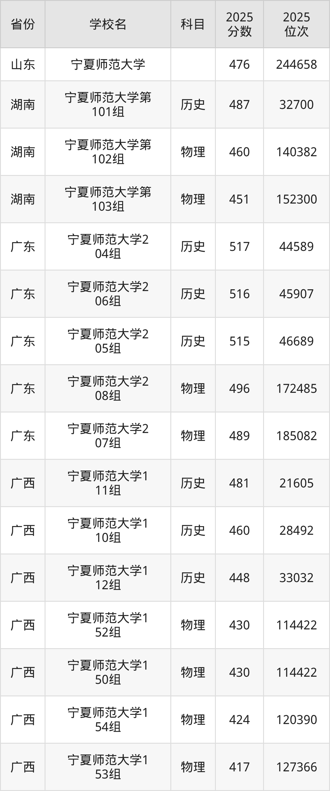 2025年宁夏师范大学在回族自治区内分历史物理科目类录取,其中历史类最低分是446分、对应位次是5785名;物理类最低分是408分,对应位次是22765名。