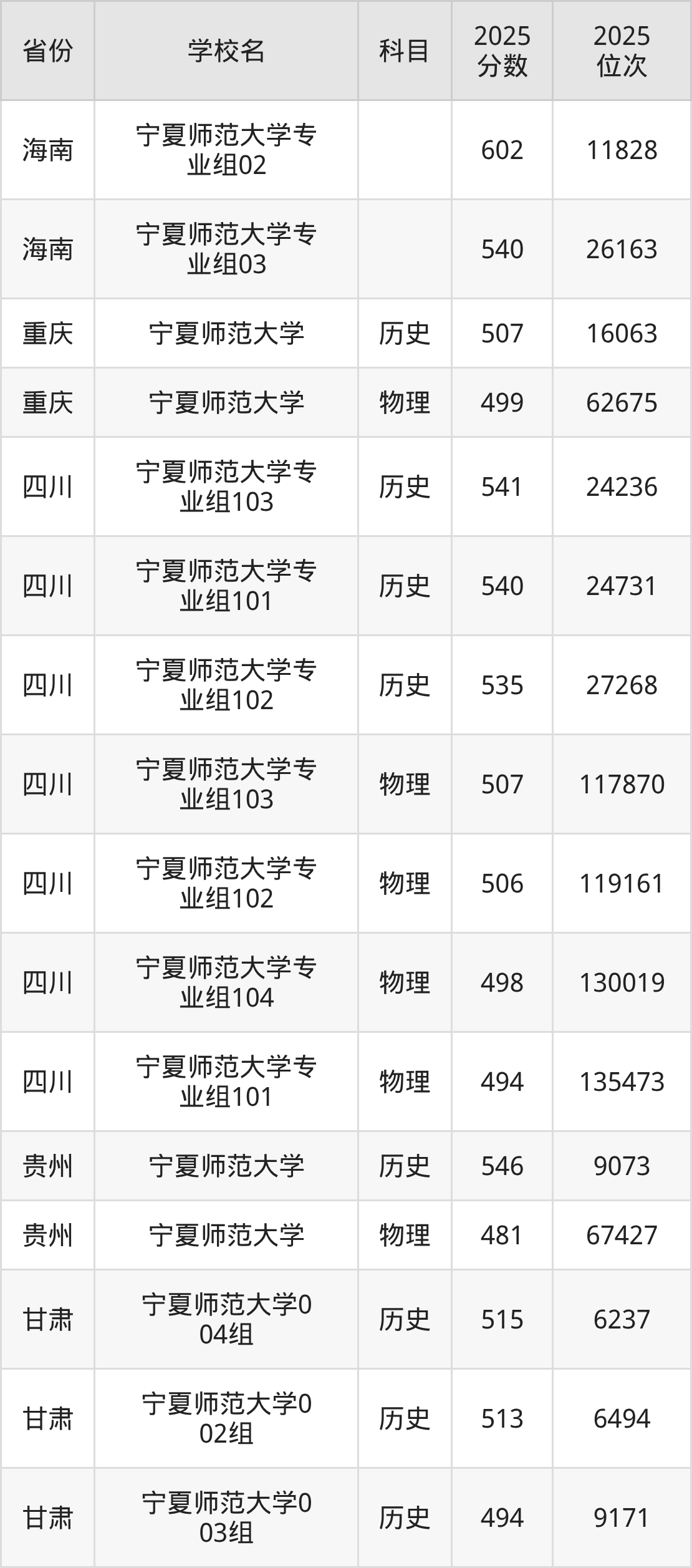 | 宁夏师范大学0 B2专业组(地 方专项) | 历史 | 493 | 2834 |