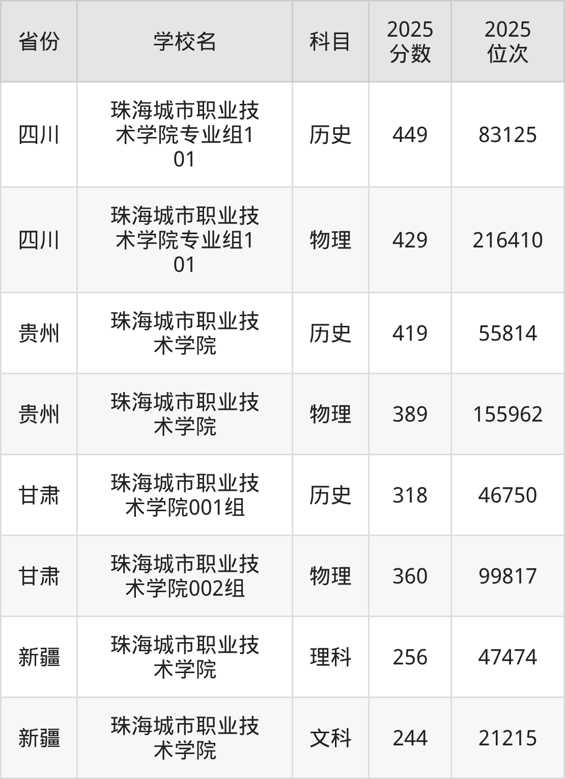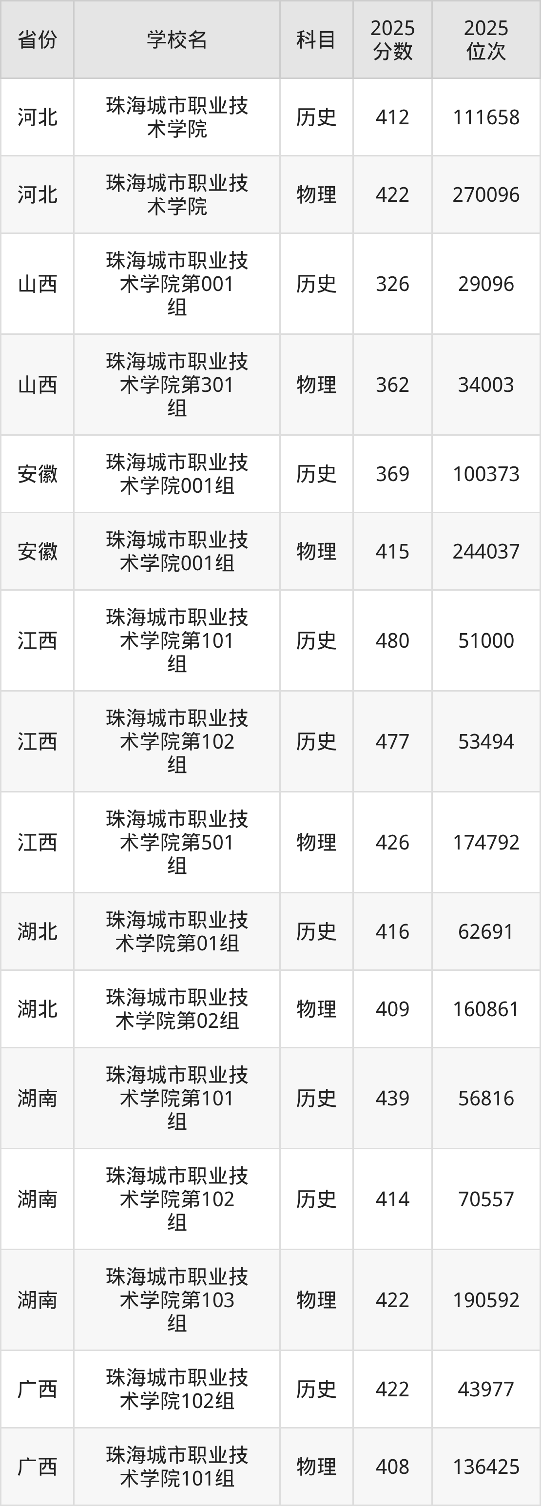 2025年珠海城市职业技术学院历史类最低分396分(165992名)、物理类最低分389分(337504名)。
