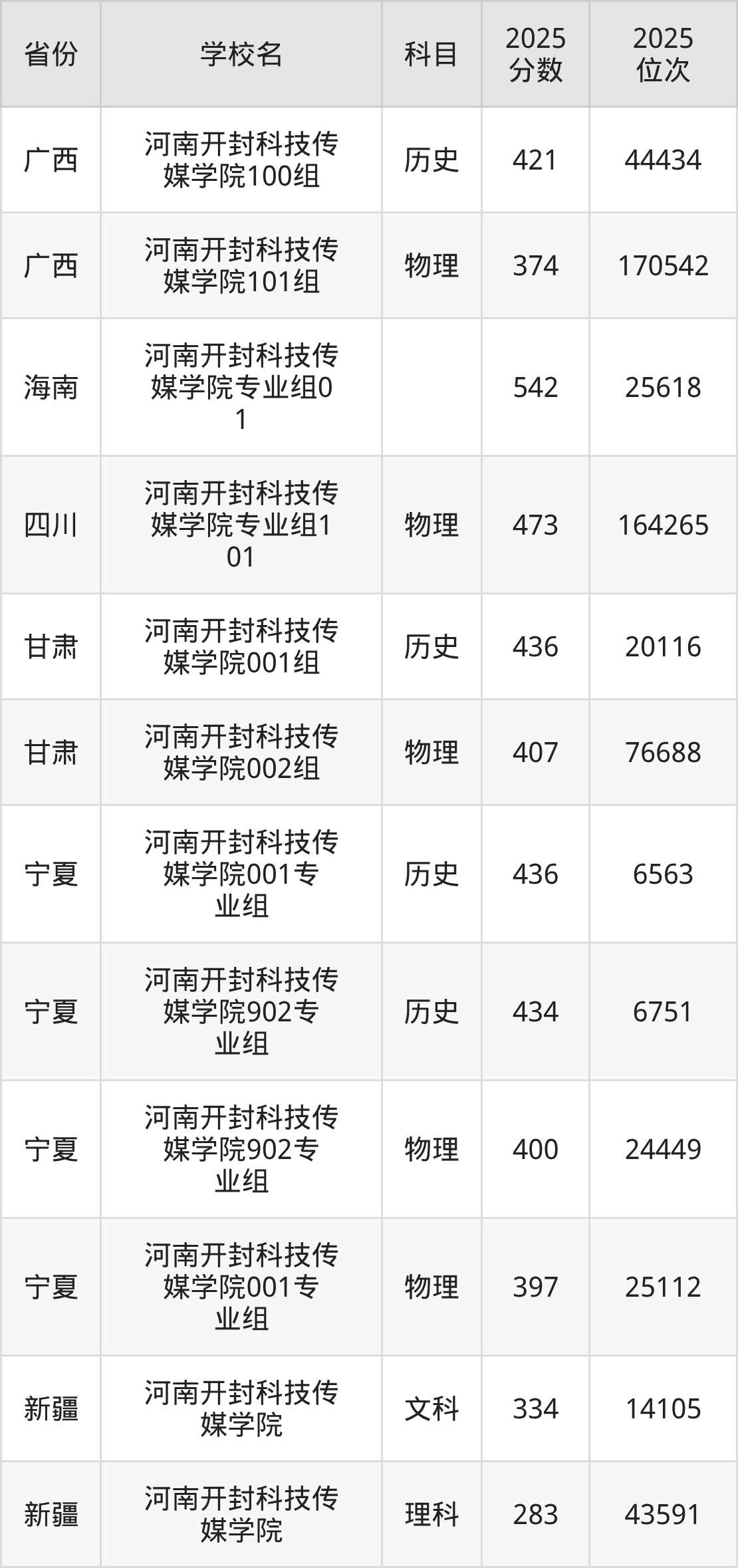 2025年河南开封科技传媒学院在省外录取分数线范围整体位于283分到542分之间,录取分数线最低在新疆理科、录取分数线最高在海南(专业组01)。