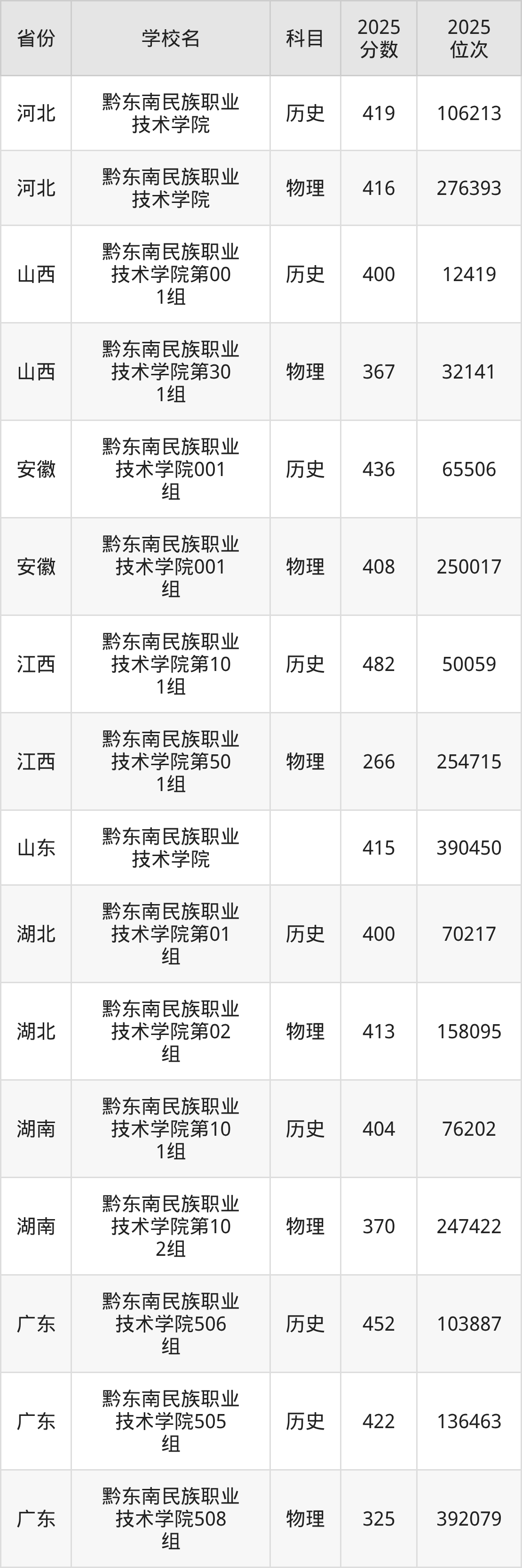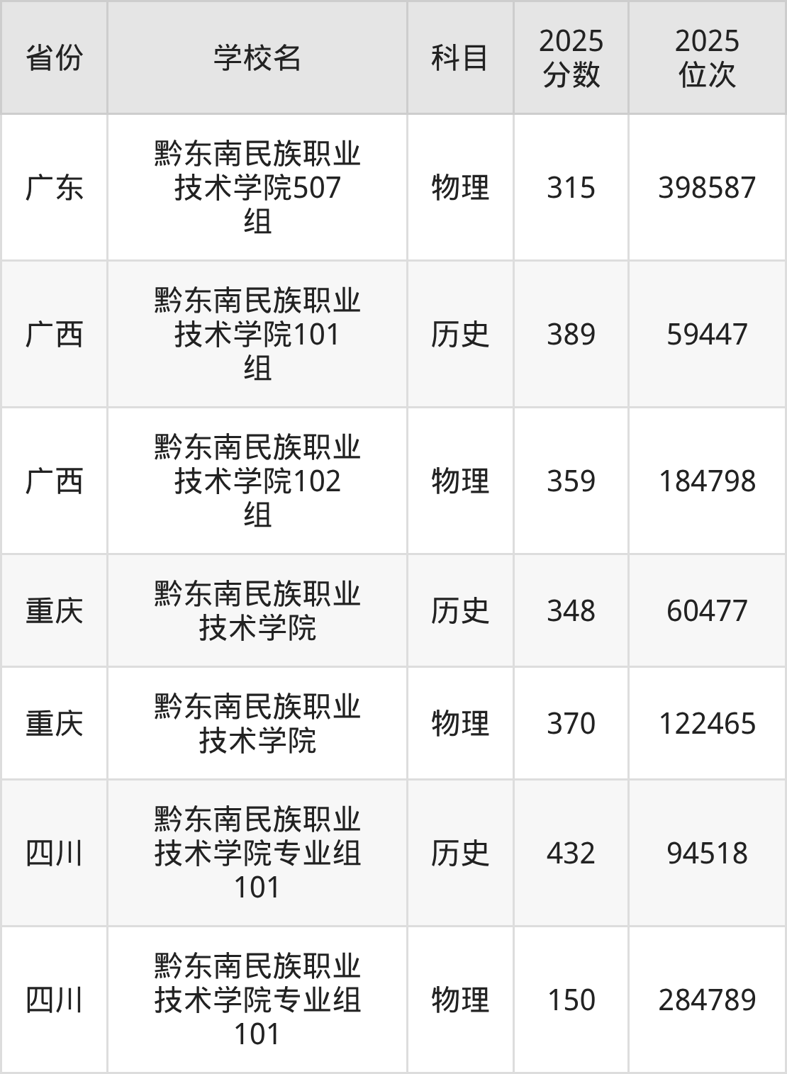 2025年黔东南民族职业技术学院历史类最低分184分(88394名)、物理类最低分196分(204921名)。