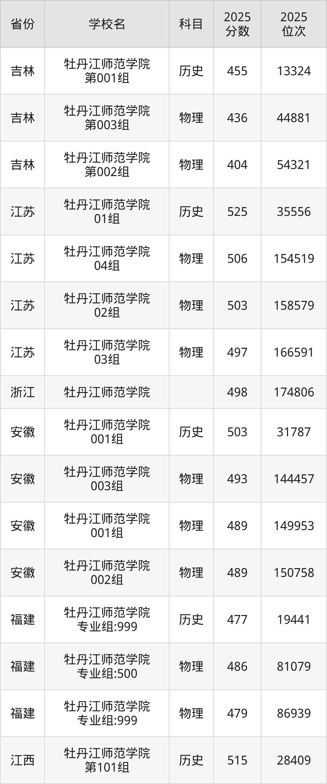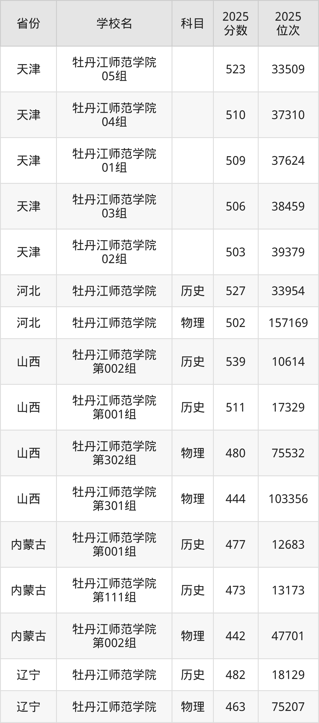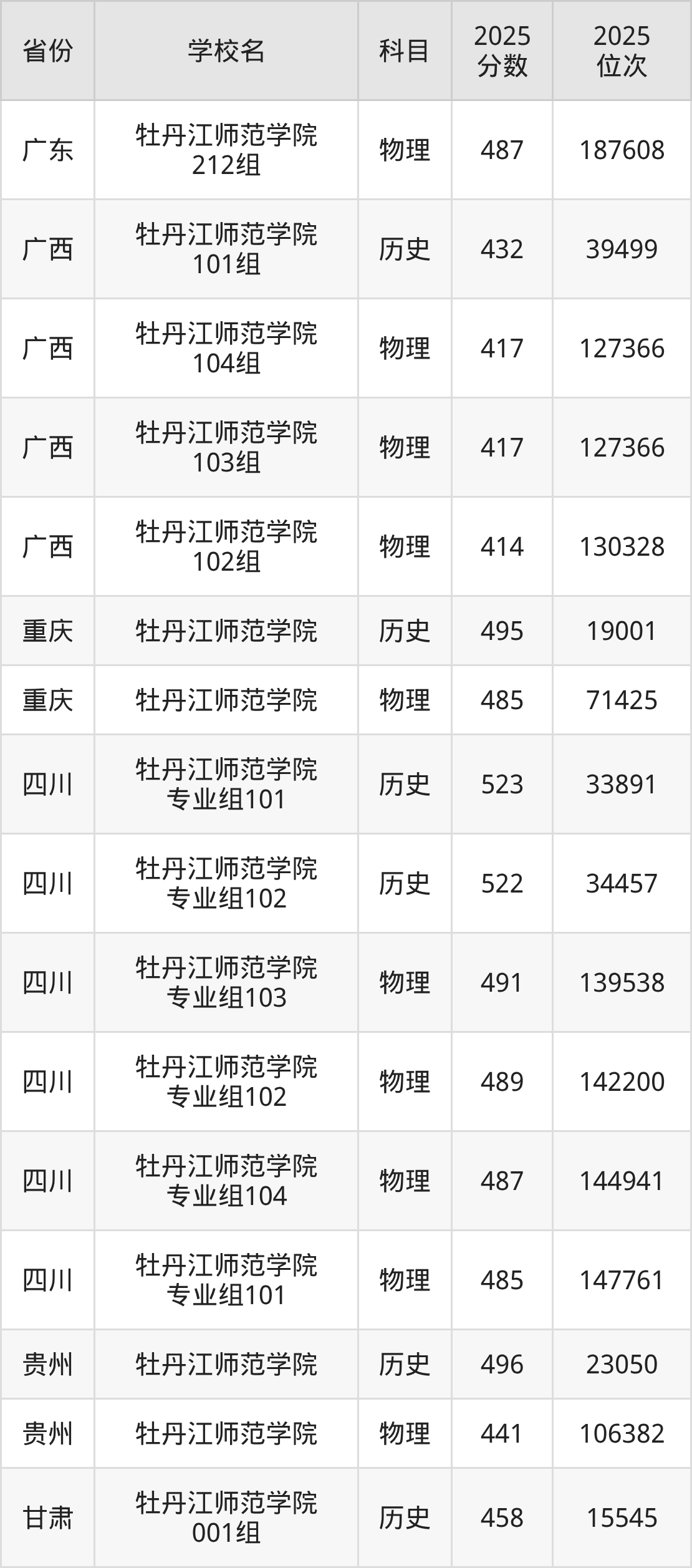 | 牡丹江师范学院 (少数民族预科 )第002组 | 物理 | 380 | 77743 |