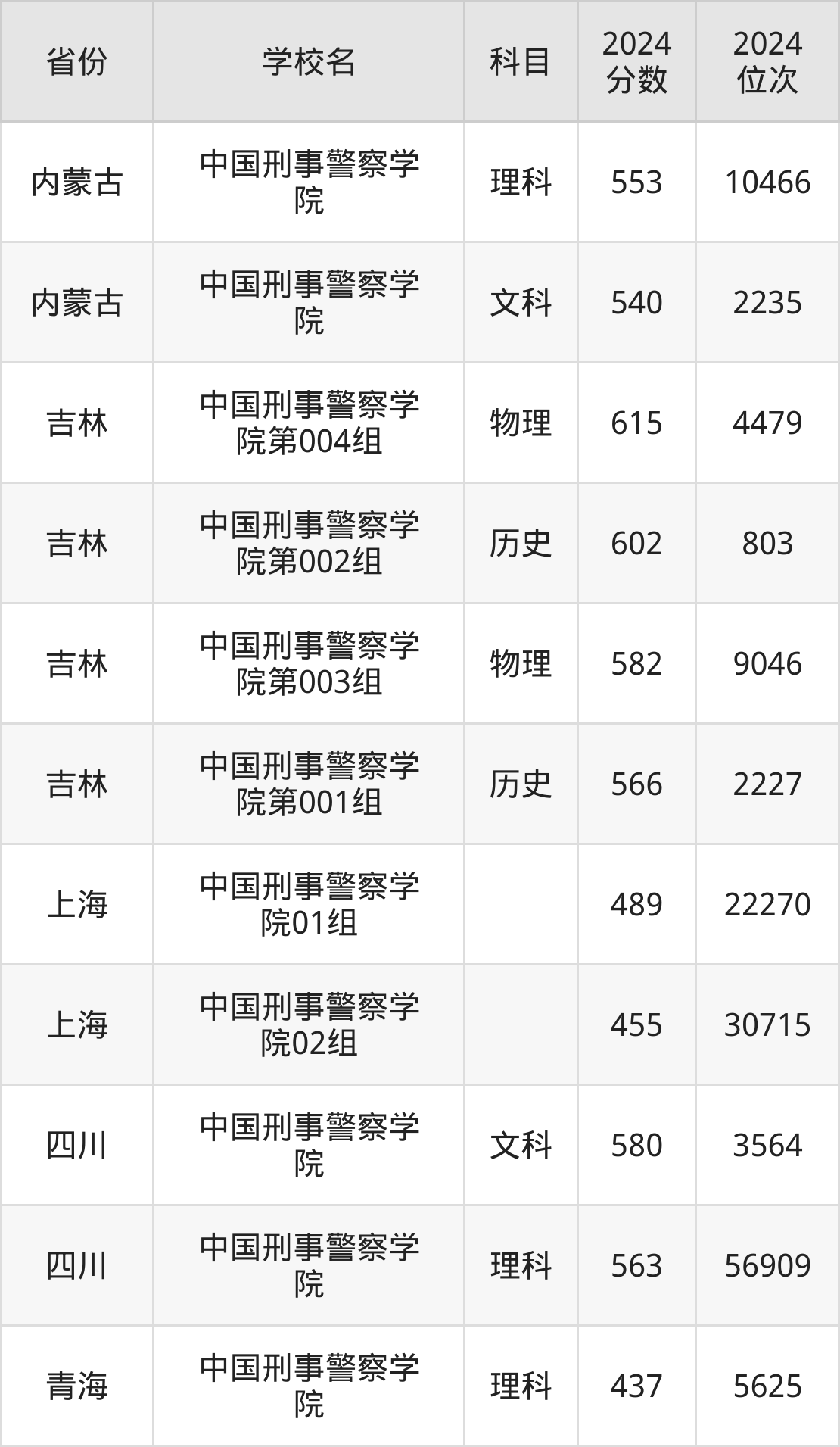 2024年中国刑事警察学院在省外录取分数线范围整体位于437分到615分之间,录取分数线最低在青海理科、录取分数线最高在吉林物理(第004组)。