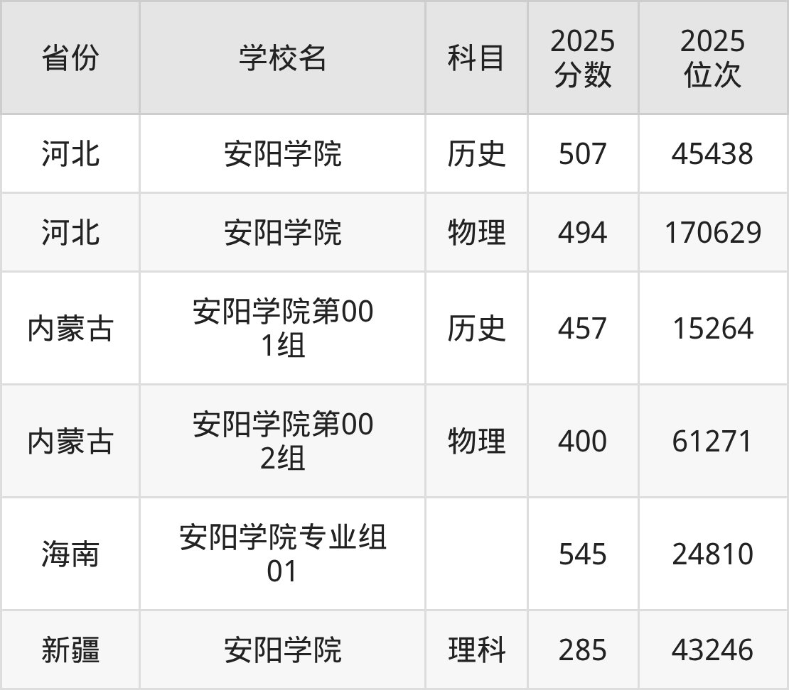 2025年安阳学院历史类最低分507分(45438名)、物理类最低分494分(170629名)。