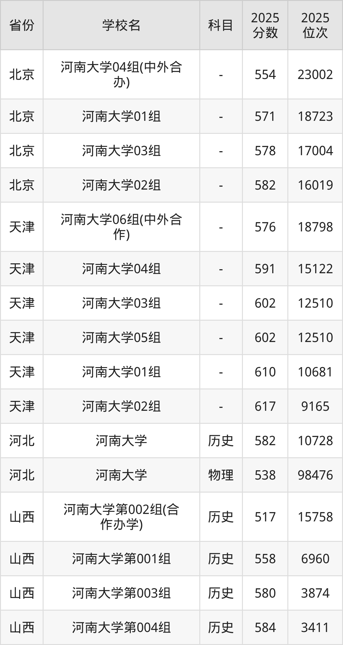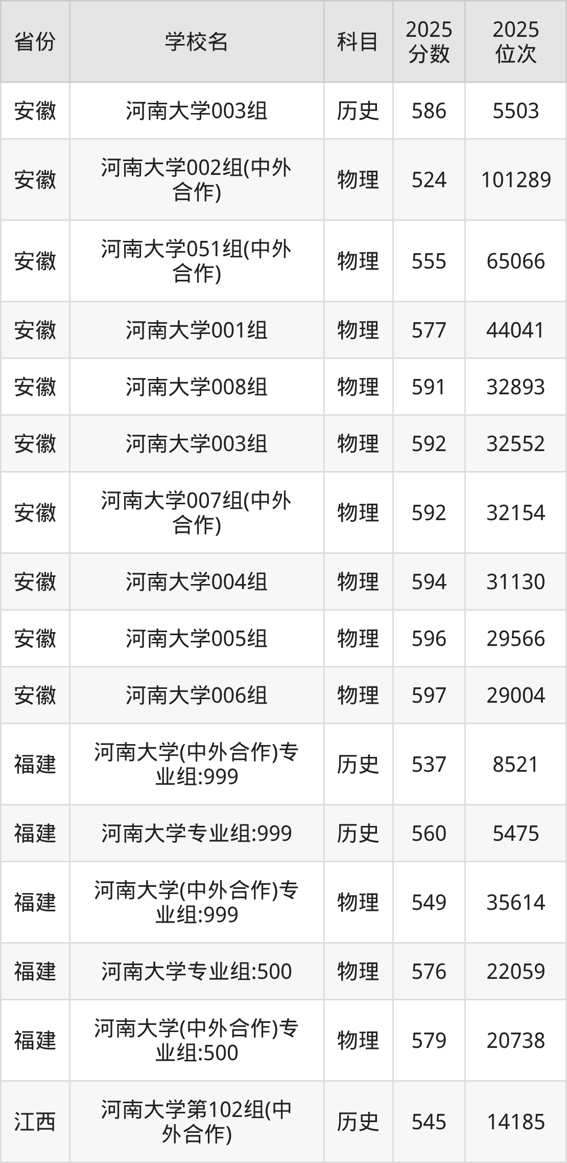 | 河南大学第30 4组(国家专项 计划组) | 历史 | 586 | 10140 |