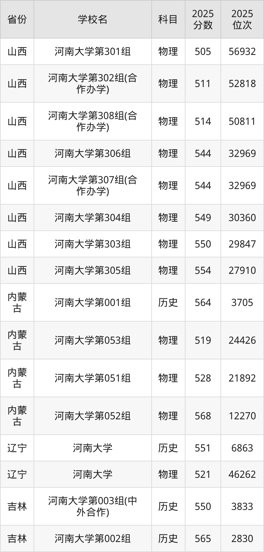 | 河南大学第30 3组(国家专项 计划组) | 物理 | 593 | 54059 |