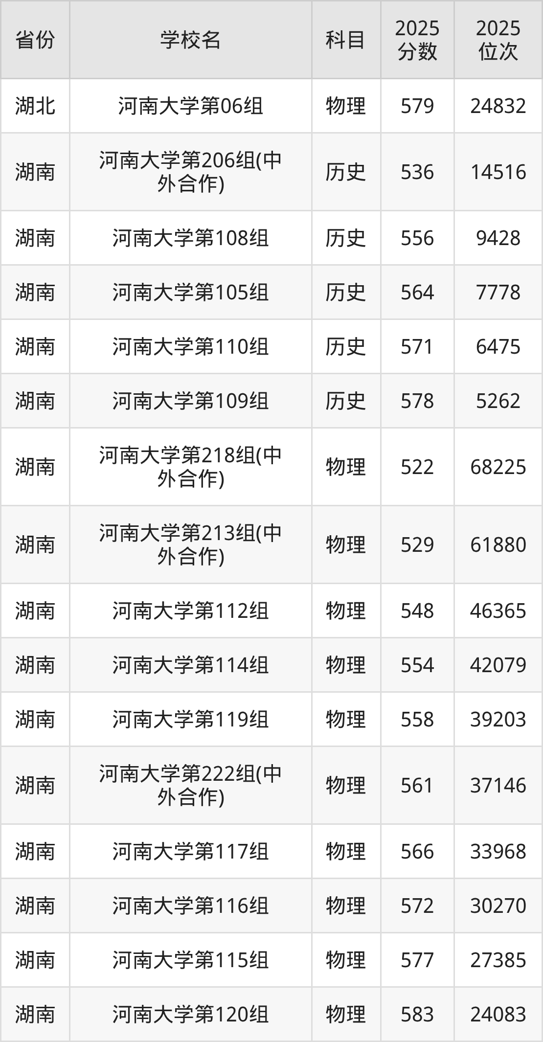 | 河南大学第40 6组(地方专项 计划组) | 物理 | 587 | 61718 |