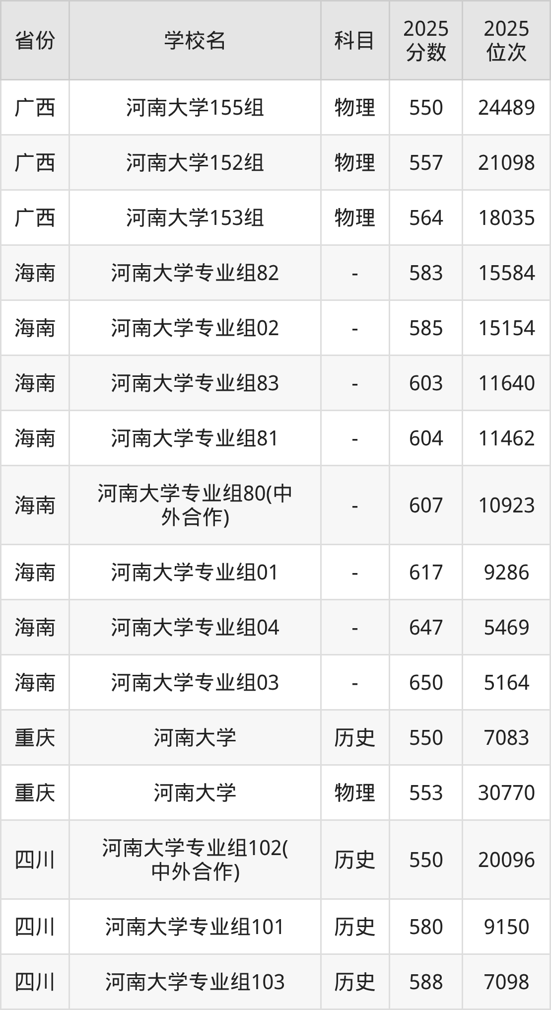| 河南大学第30 2组(国家专项 计划组) | 物理 | 608 | 37473 |