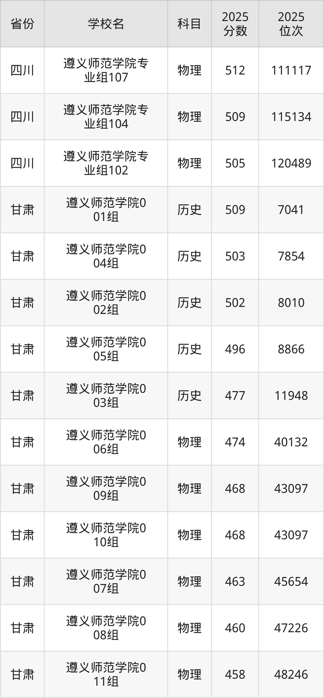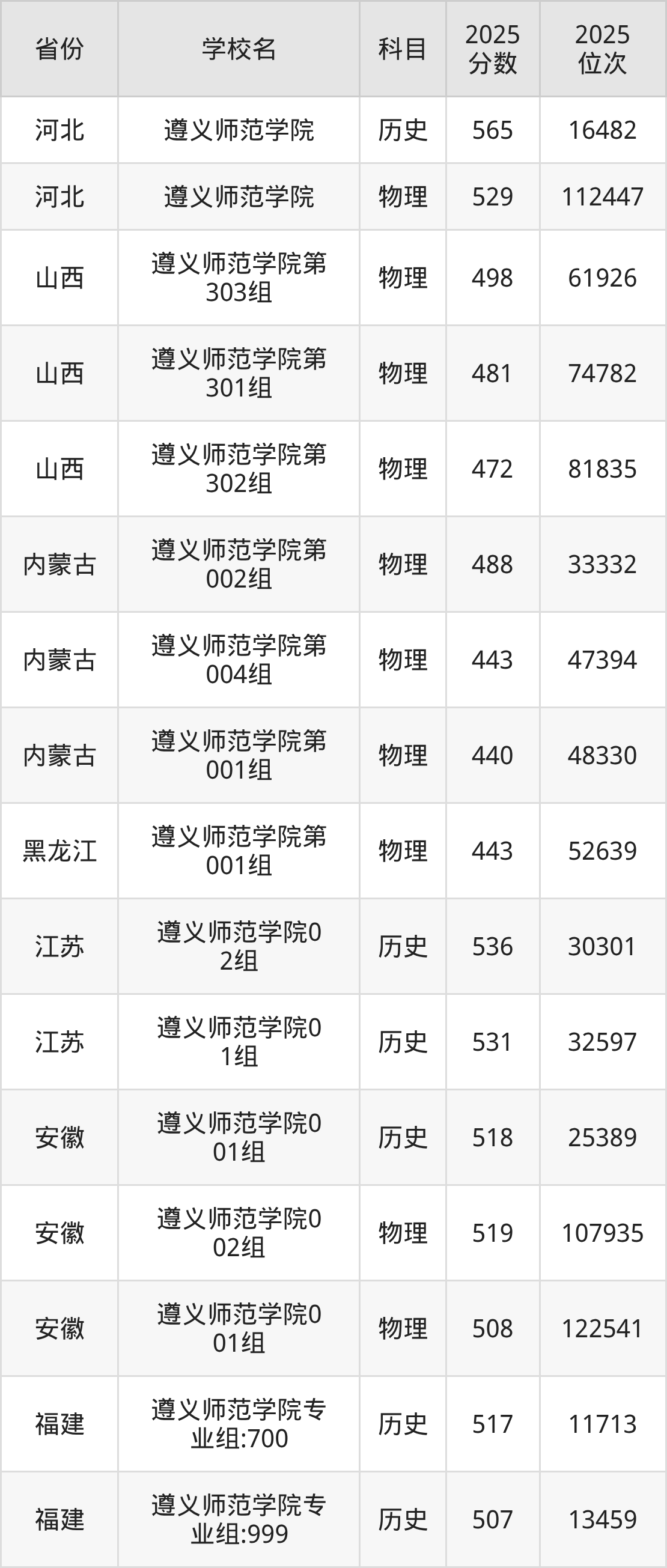 2025年遵义师范学院历史类最低分487分(26876名)、物理类最低分433分(114224名)。