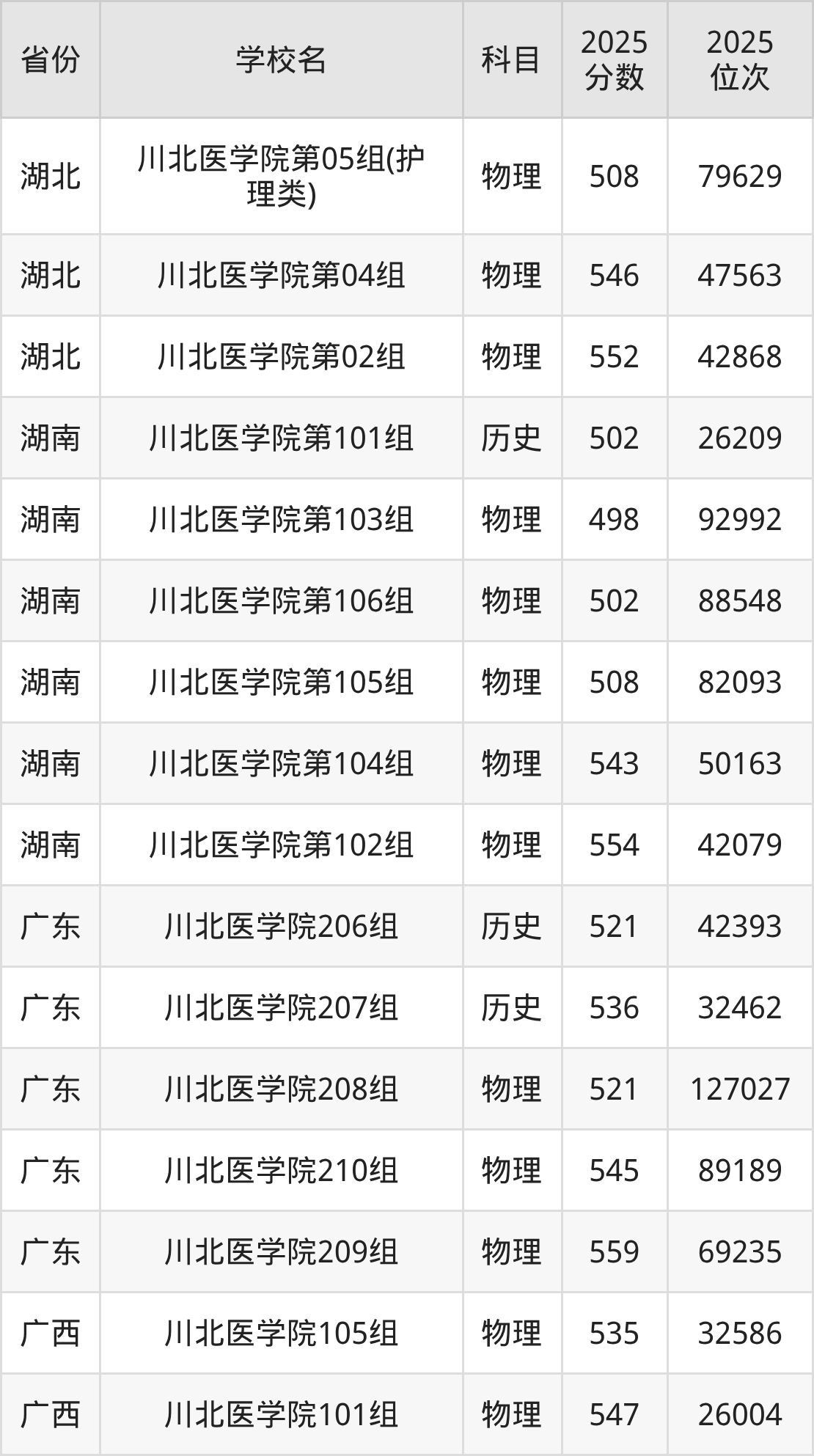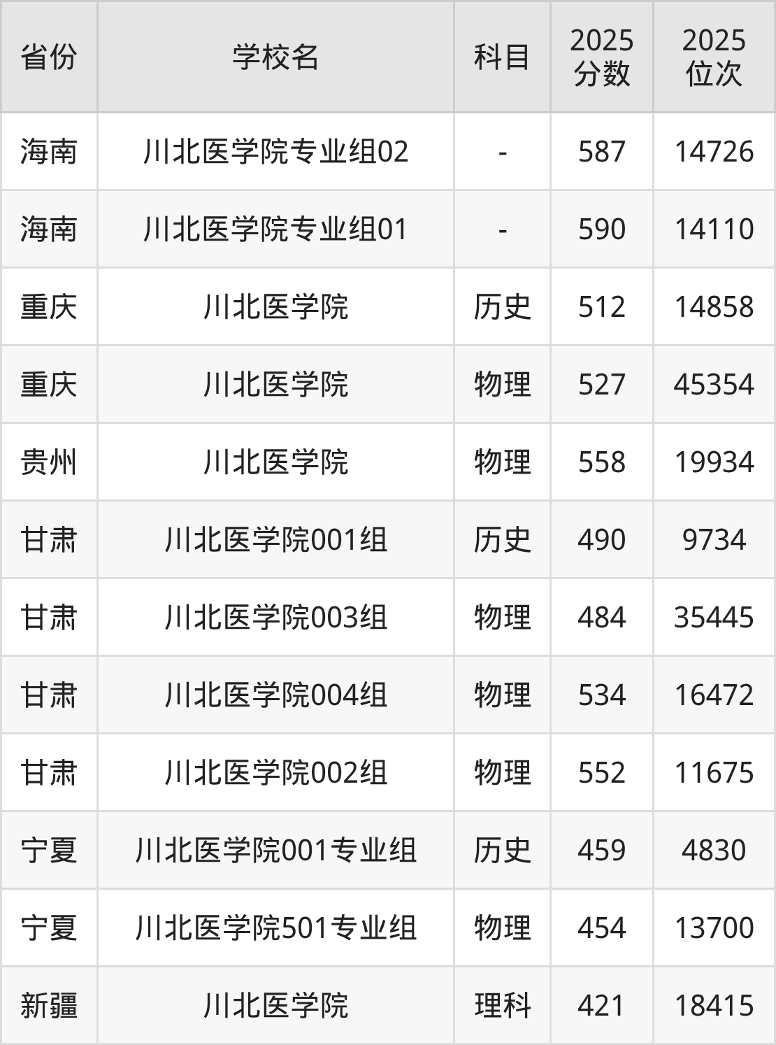 2025年川北医学院在省内,其中历史类最低分是529分、对应位次是30453名;物理类最低分是511分,对应位次是112408名。