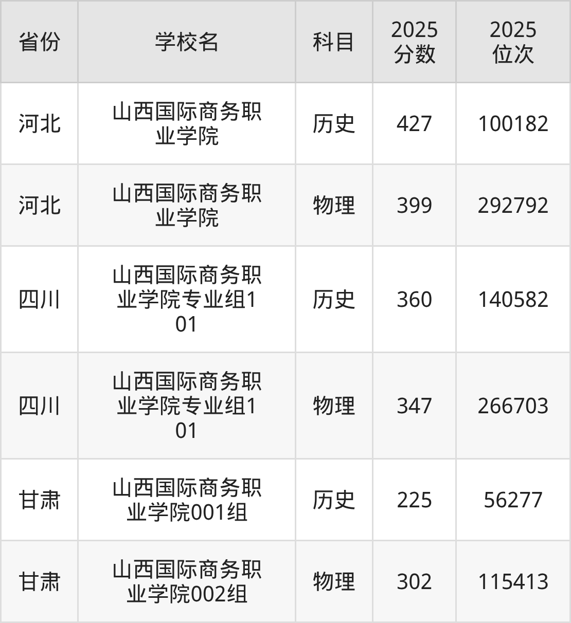 2026年山西国际商务职业学院录取分数线预计在320分及以上,在各省录取最低分存在一定差异,如:2025年山西国际商务职业学院在四川录取最低历史类360分、物理类347分,在甘肃录取最低历史类225分、物理类302分,在河北录取最低历史类427分、物理类399分。