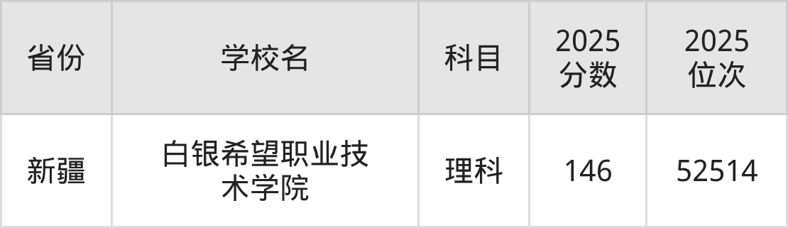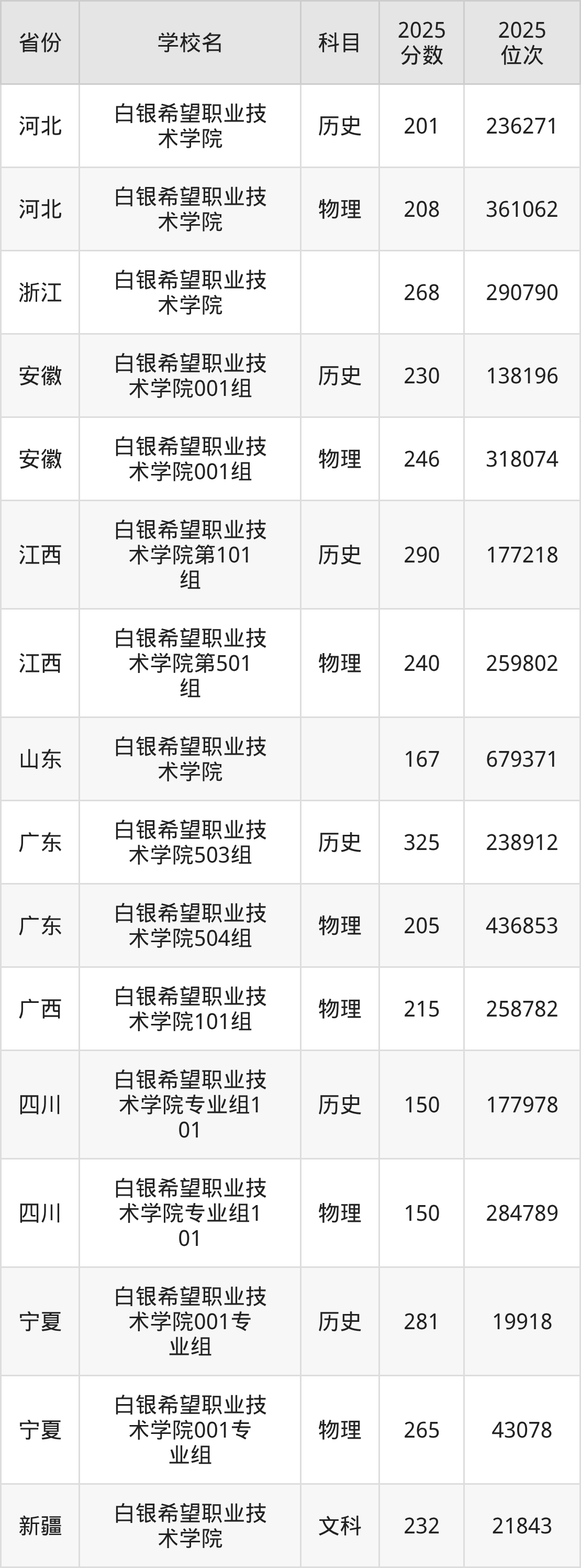 2025年白银希望职业技术学院历史类最低分172分(56941名)、物理类最低分180分(120677名)。
