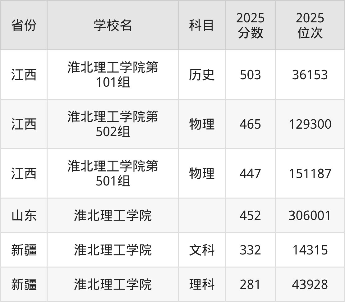 2026年淮北理工学院录取分数线预计在430分及以上,在各省录取最低分存在一定差异,如:2025年淮北理工学院在江西录取最低历史类503分、物理类447分,在山东录取最低分是452分,在新疆录取最低文科332分、理科281分。