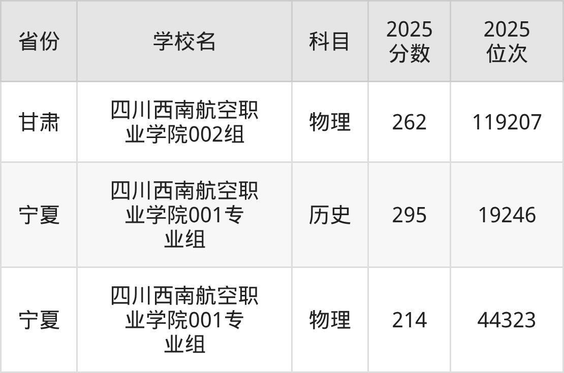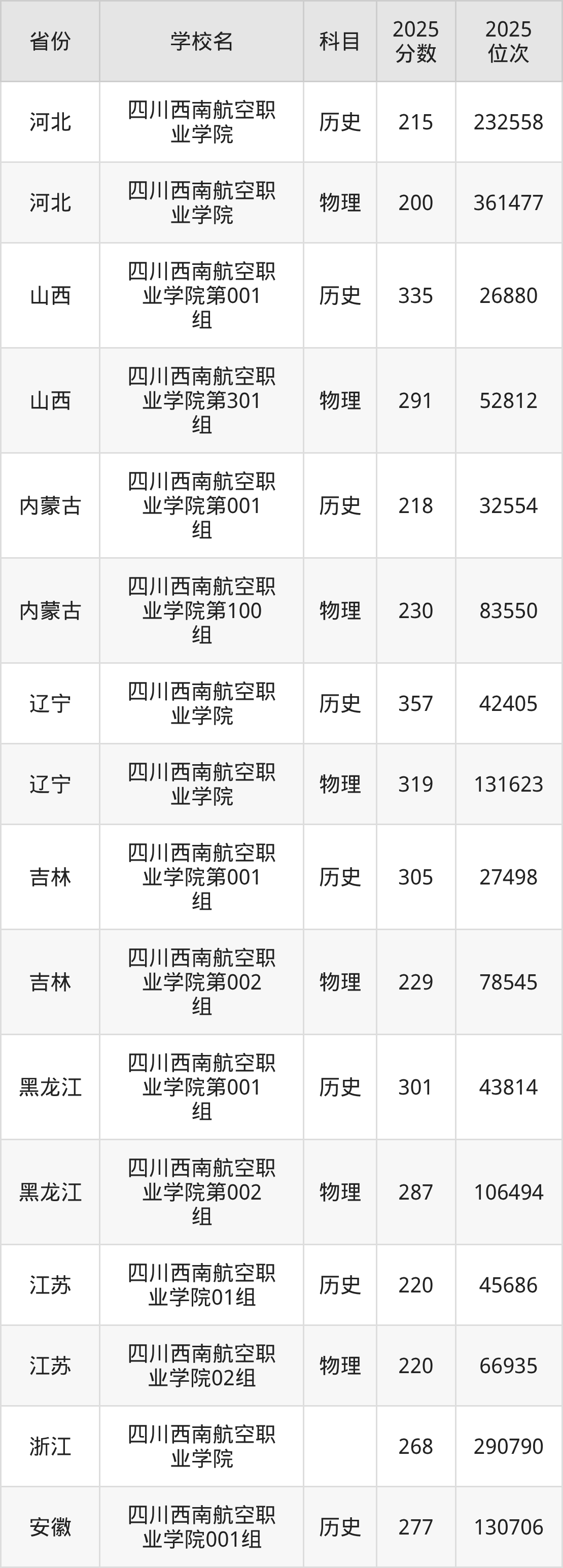 2025年四川西南航空职业学院在省内分历史物理科目类录取,其中历史类最低分是311分、对应位次是162039名;物理类最低分是341分,对应位次是268575名。