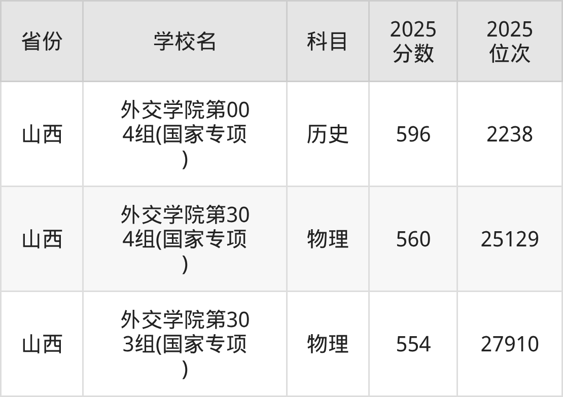 2025年外交学院在市外录取分数线范围整体位于554分到596分之间,录取分数线最低在山西物理(第303组(国家专项))、录取分数线最高在山西历史(第004组(国家专项))。