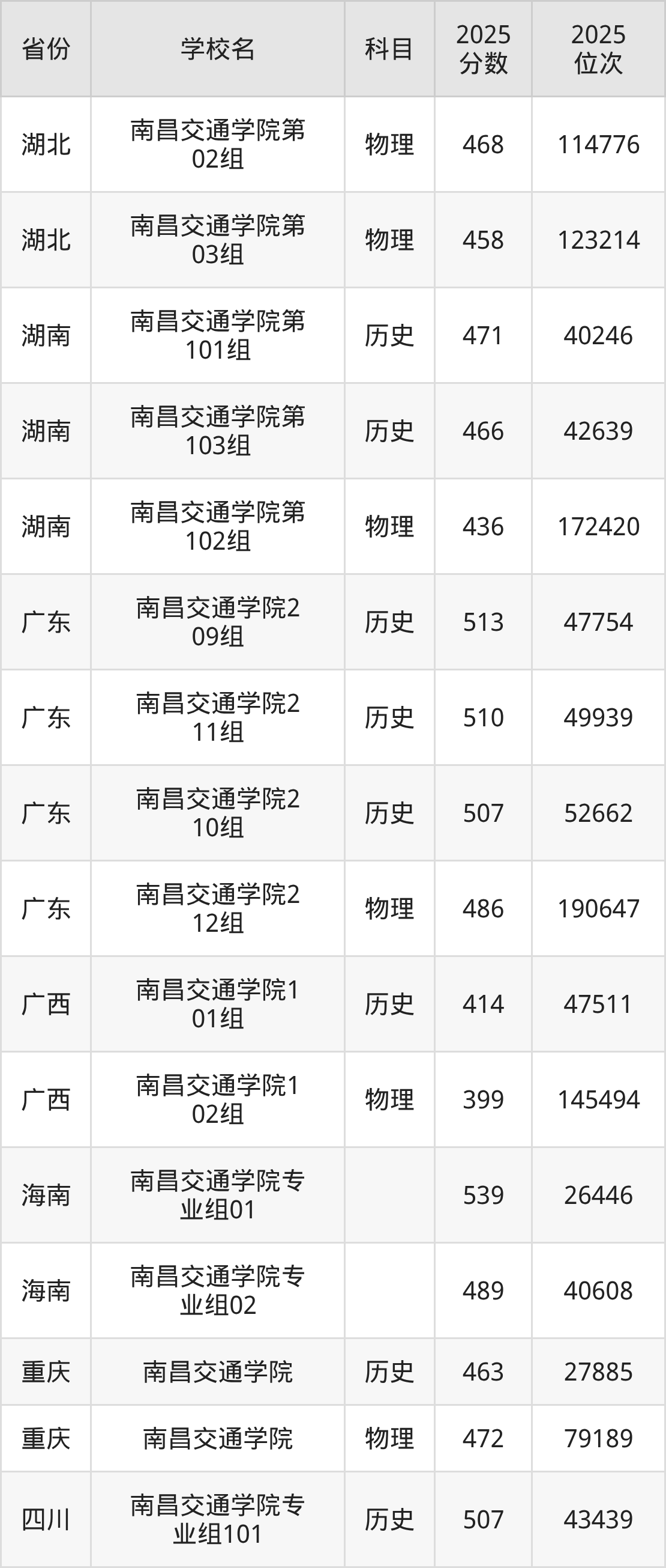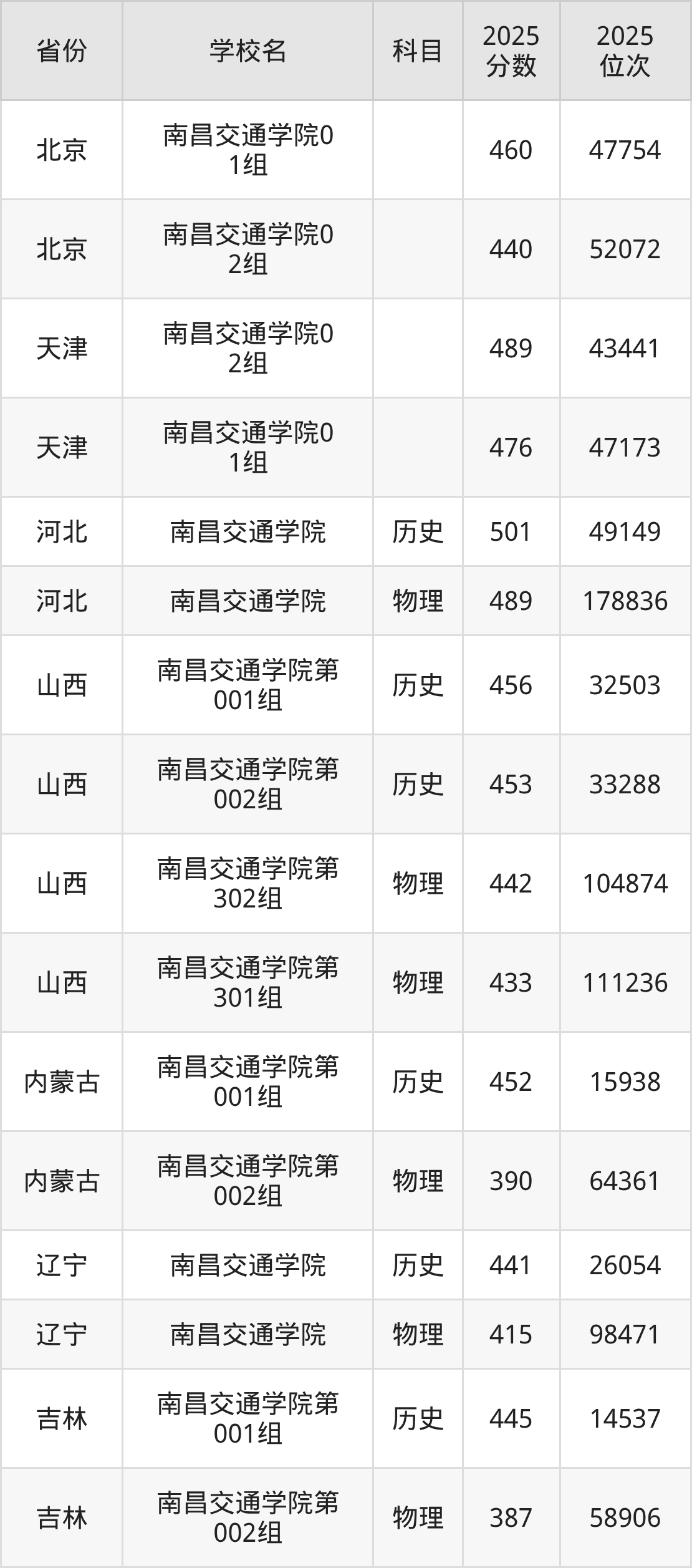 2025年南昌交通学院历史类最低分496分(40515名)、物理类最低分435分(165263名)。