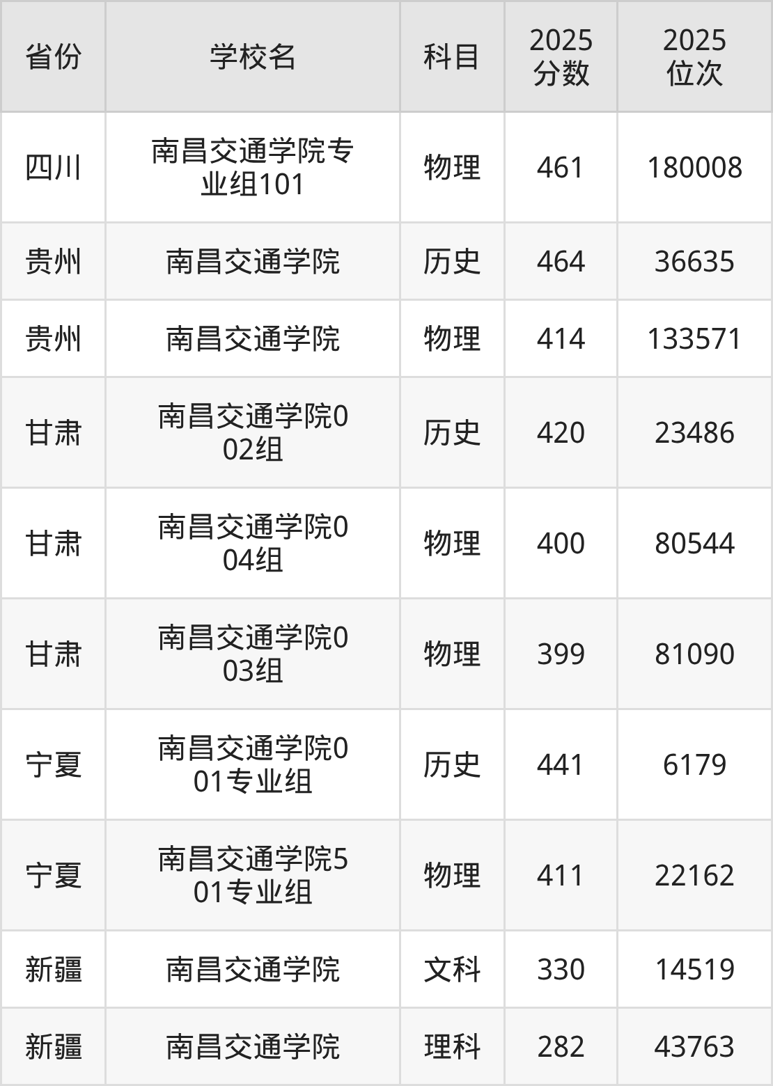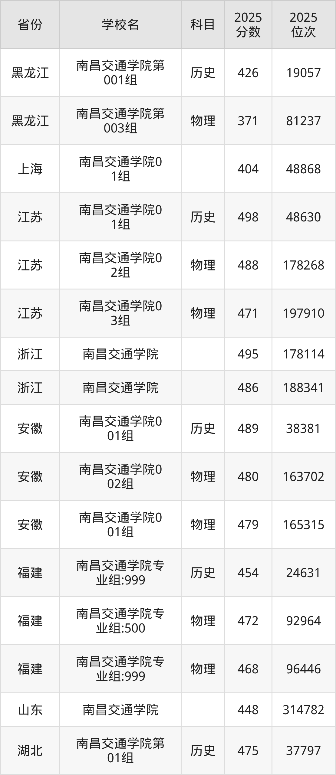 2025年南昌交通学院在省内分历史物理科目类录取,其中历史类最低分是496分、对应位次是40515名;物理类最低分是435分,对应位次是165263名。