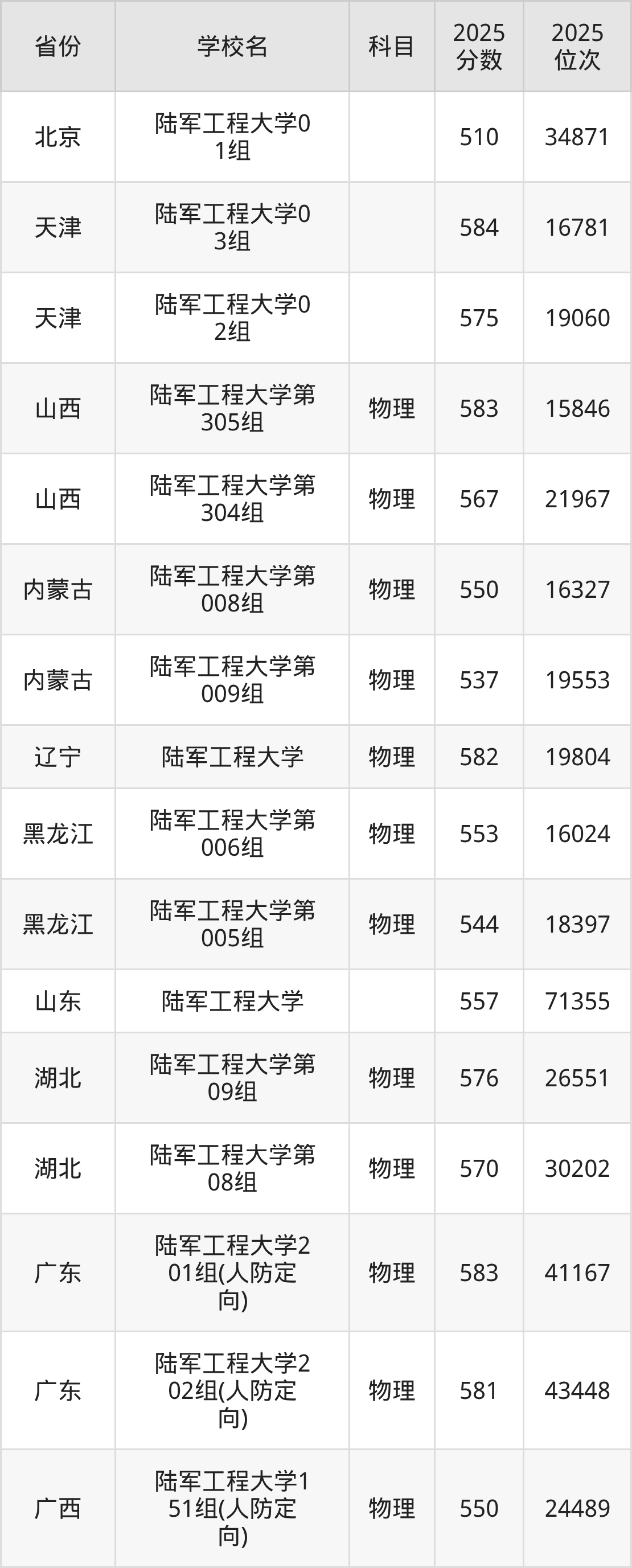 下面是陆军工程大学2025年录取分数线各省汇总,一起来了解下吧。