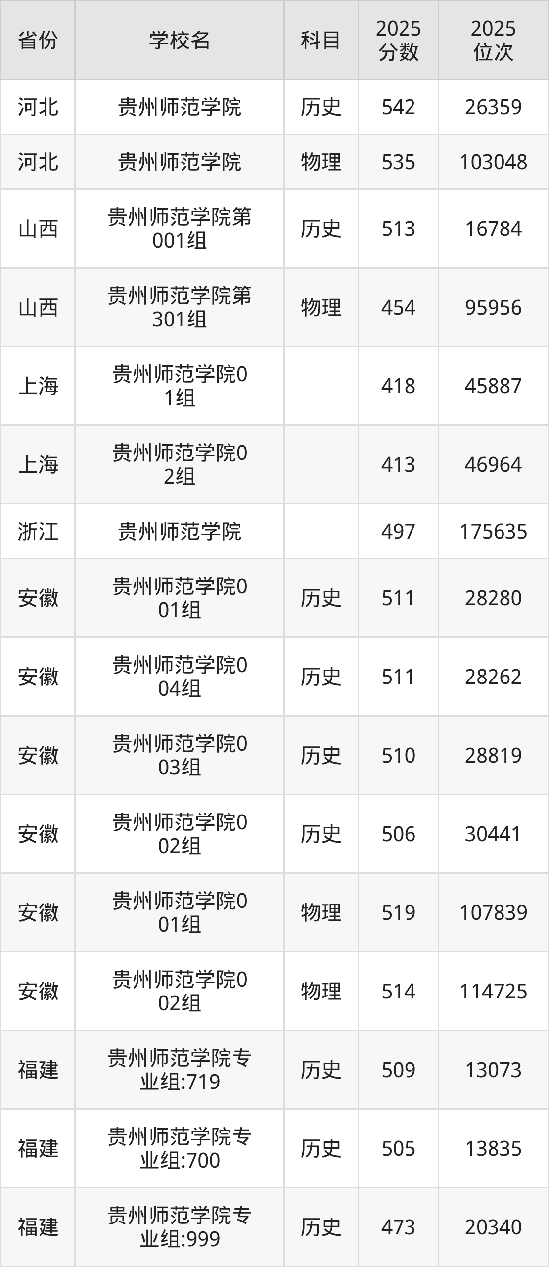 | 贵州师范学院( 民族班) | 历史 | 492 | 24807 |