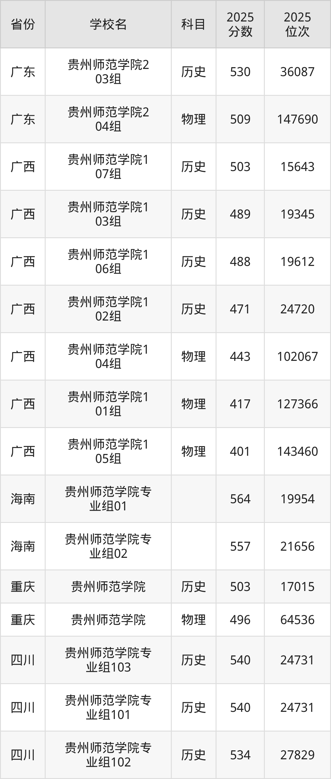 | 贵州师范学院( 地方专项计划) | 历史 | 515 | 16695 |