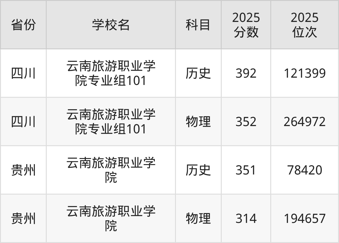 2026年云南旅游职业学院录取分数线预计在350分及以上,在各省录取最低分存在一定差异,如:2025年云南旅游职业学院在四川录取最低历史类392分、物理类352分,在贵州录取最低历史类351分、物理类314分。