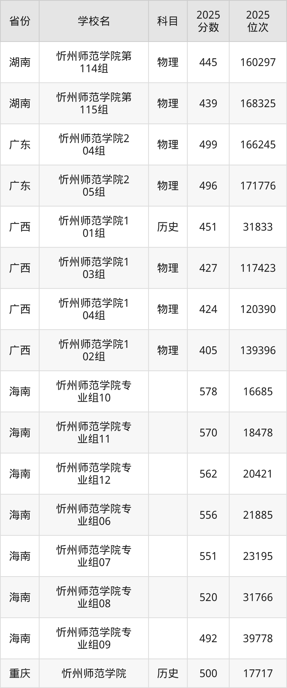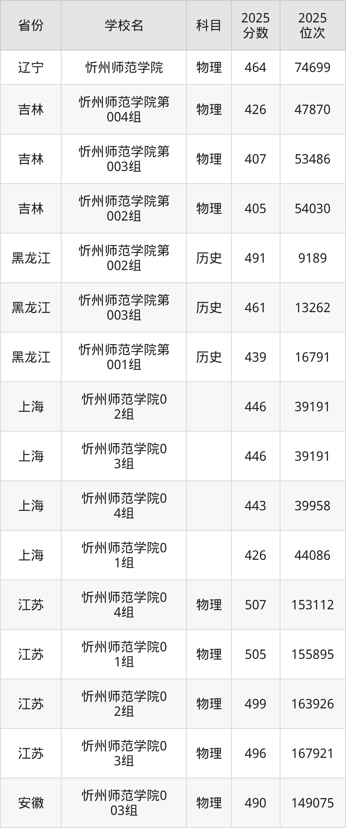 2025年忻州师范学院在省内分历史物理科目类录取,其中历史类最低分是481分、对应位次是25705名;物理类最低分是445分,对应位次是102587名。