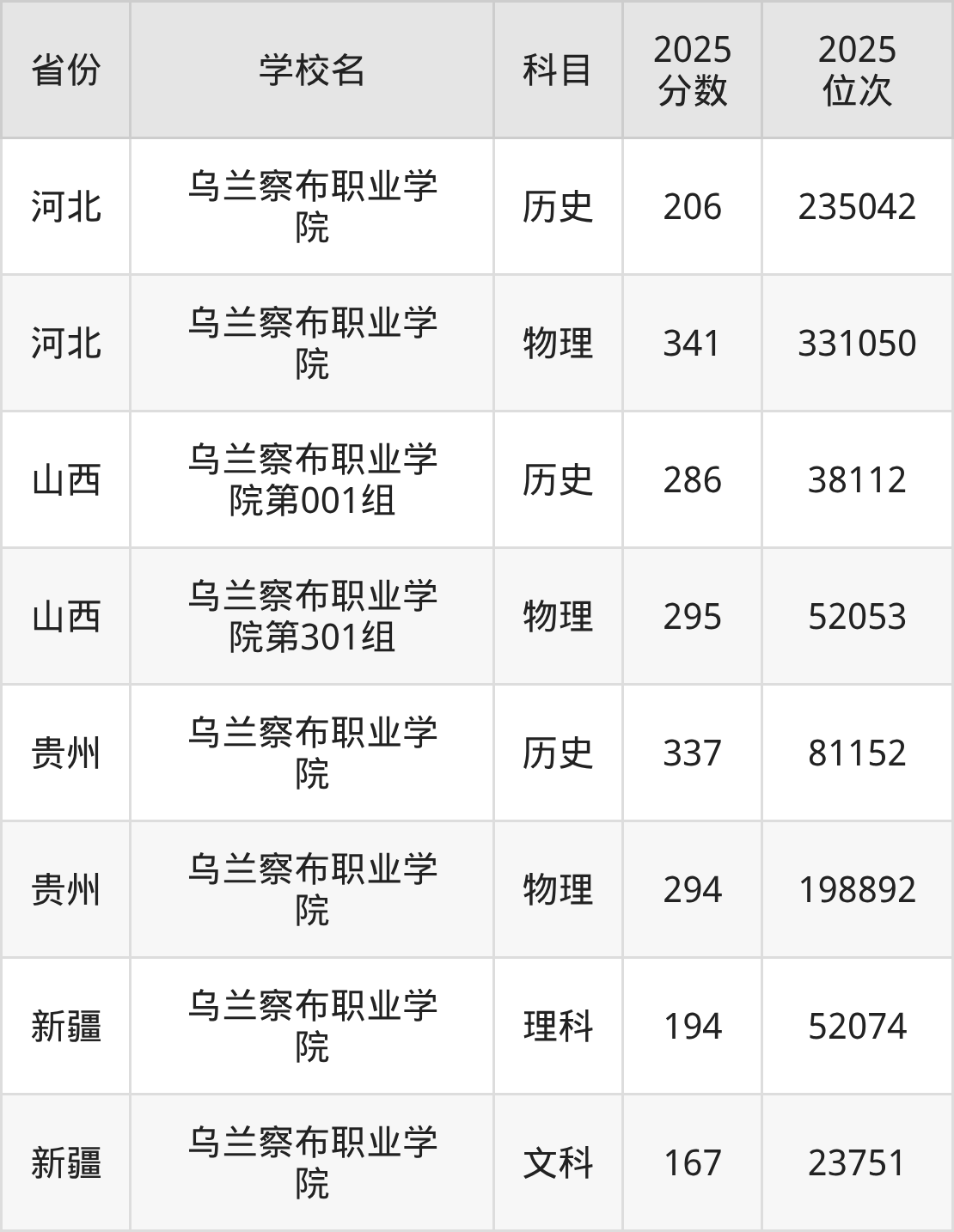 下面是乌兰察布职业学院2025年录取分数线各省汇总,一起来了解下吧。