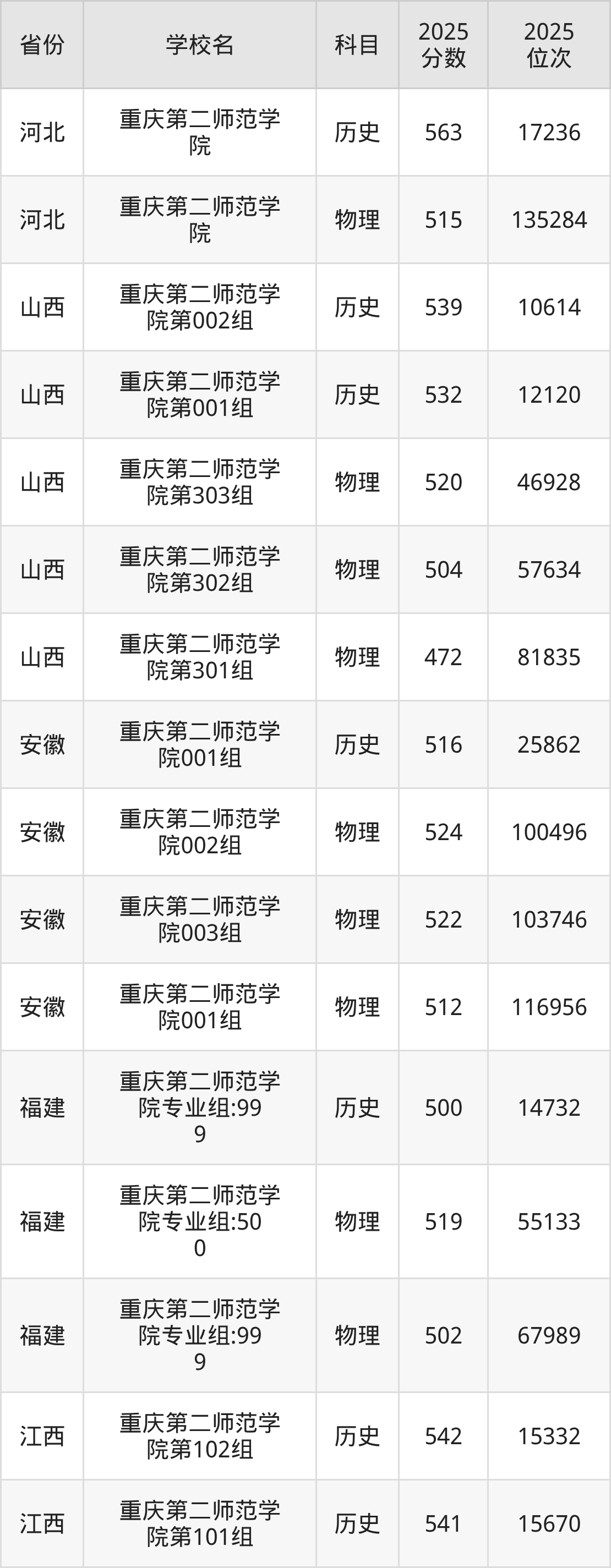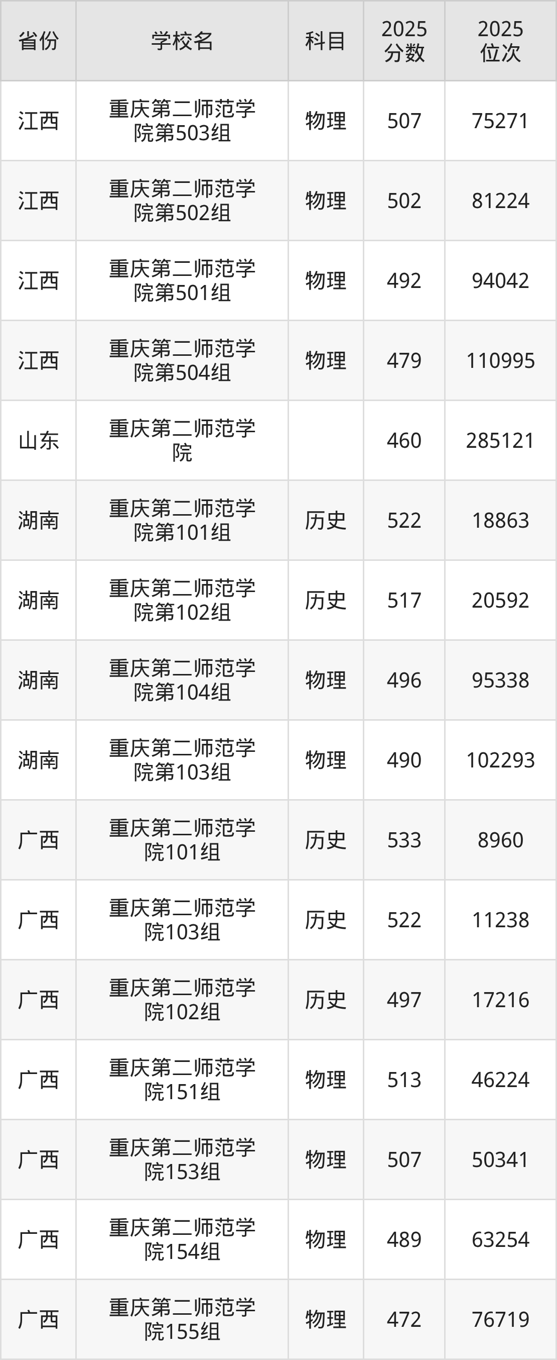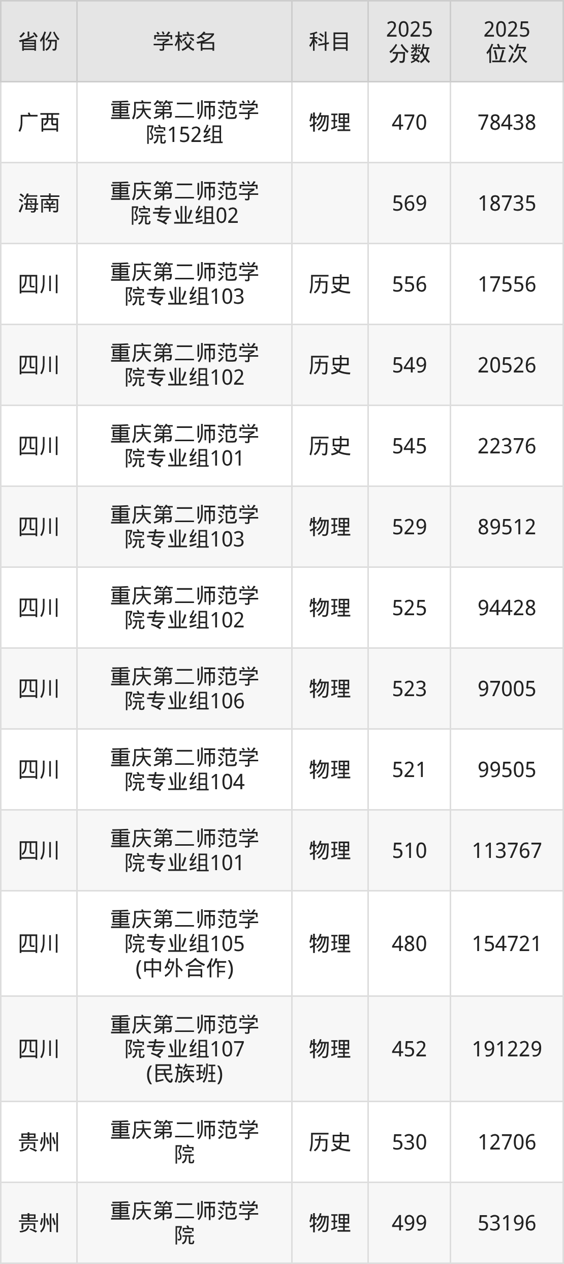 2025年重庆第二师范学院历史类最低分506分(16288名)、物理类最低分466分(82660名)。